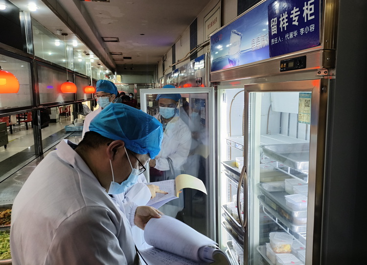 工作组首先来到百景苑食堂,对食堂后厨各功能区、售卖区进行了全面检查,对留样管理、食品添加剂管理、餐具洗消管理等关键环节进行了深入检查,并对关键岗位的食堂从业人员进行了专业提问。随后,工作组来到物资配送中心,对食堂物资的采购、验收、储存及集中切配管理进行了详细查看。