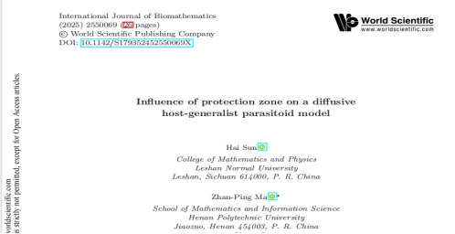 本网讯(文、图/樊华娜)近日,我院孙海教授与河南理工大学数学与信息科学学院马战平博士合作的两篇论文分别刊登在《International Journal of Biomathematics》,《Computational and Applied Mathematics》,我校为第一单位。两篇论文均聚焦非线性偏微分方程中的反应扩散模型展开研究。