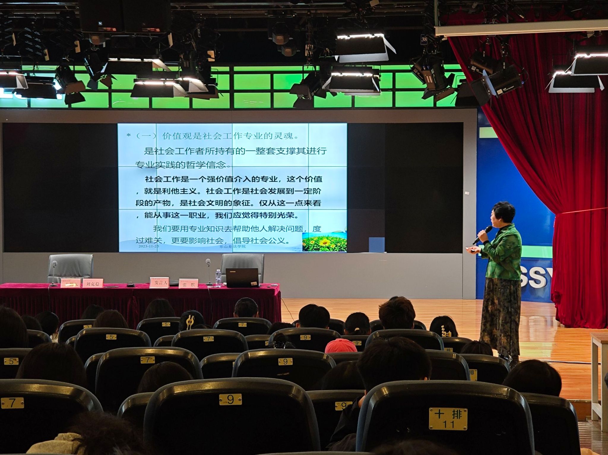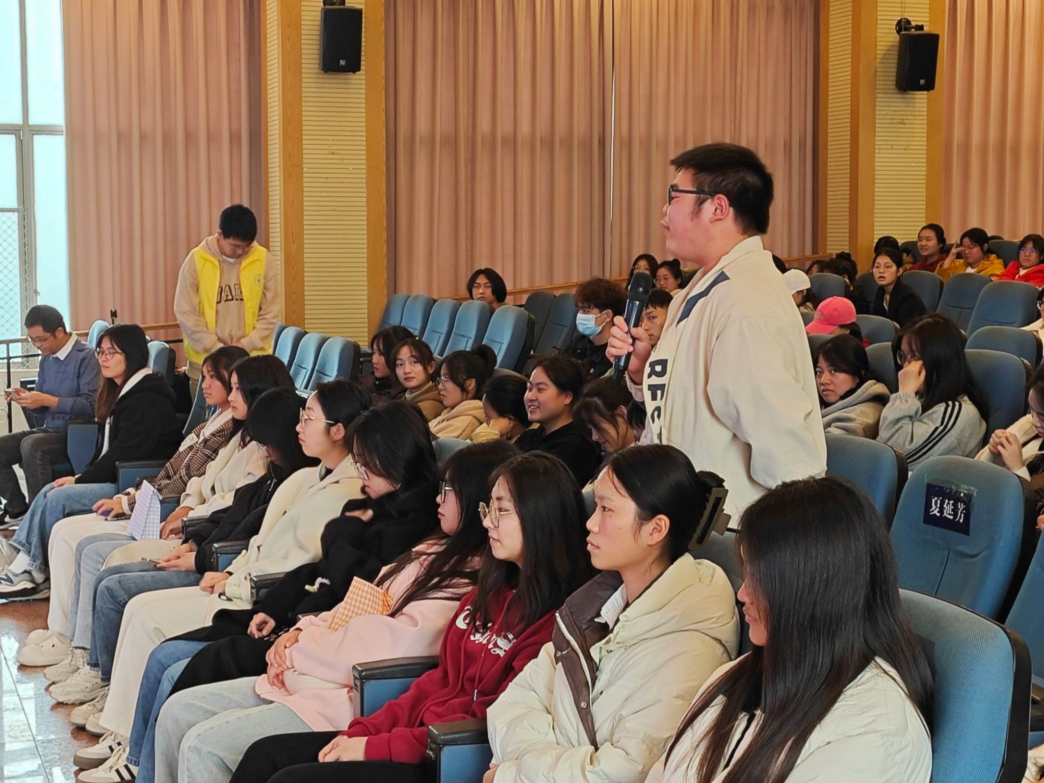 本次讲座主要是由张默为同学们分享她对于社工专业的理解以及社工专业未来的就业方向。首先,张默在做学术分享前带着大家唱了《这世界有那么多人》,里面有一句歌词是“多幸运有个我们”,这句歌词让同学们深深感受到了社工情。接着,厦门市湖里区开心社工创始人韩秀云为同学们分享了她的人生经历,包括她与社工是如何结缘的,她是怎样将这份社工事业做好的等,为同学们分享了宝贵的经验。然后张默说到:“相对于很多专业,社会工作正值发展初期,也正是因此,我们可以有机会在很年轻的时候就参与到重要的事情当中去。”这让同学们的信心和热情倍增。最后是互动环节,同学们积极提问,张默与韩秀云耐心解答,令同学们受益匪浅。