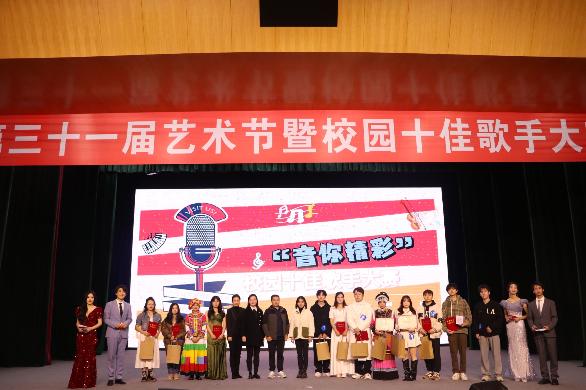 经过一个半小时的角逐李晓芳、朱镜磊、林祉伊、刘佳艺廖皓申(组合)、王秋霞、李婷、李光艳、曲别王芳、王磊、熊子杰同学荣获校园“十佳歌手”的称号,在场领导嘉宾为参赛选手颁奖,为此次比赛画上圆满的句号。