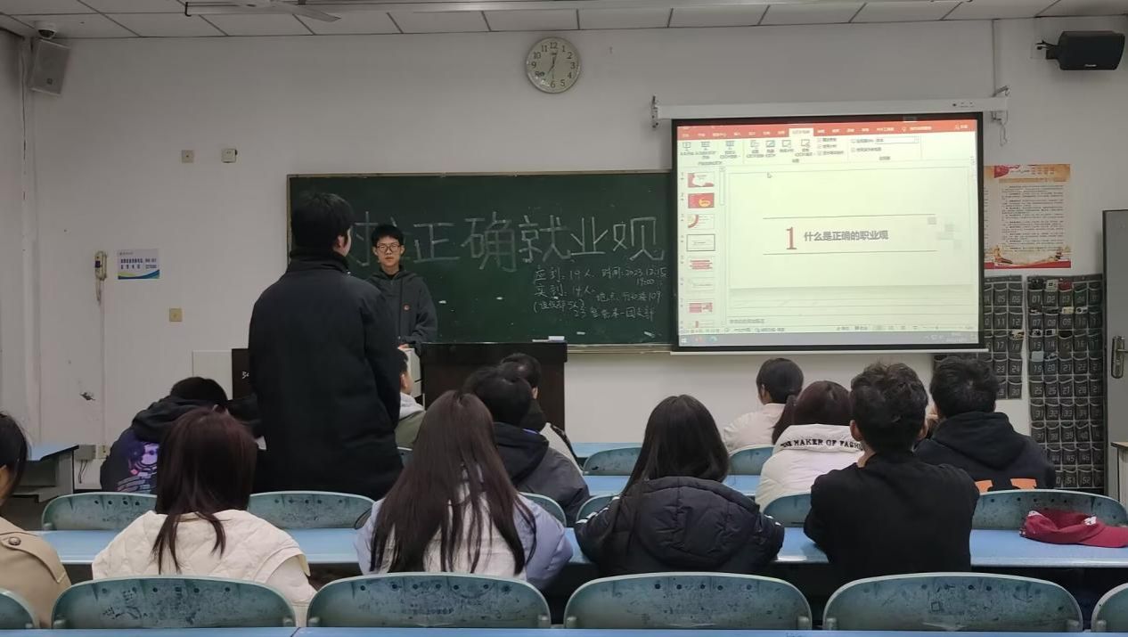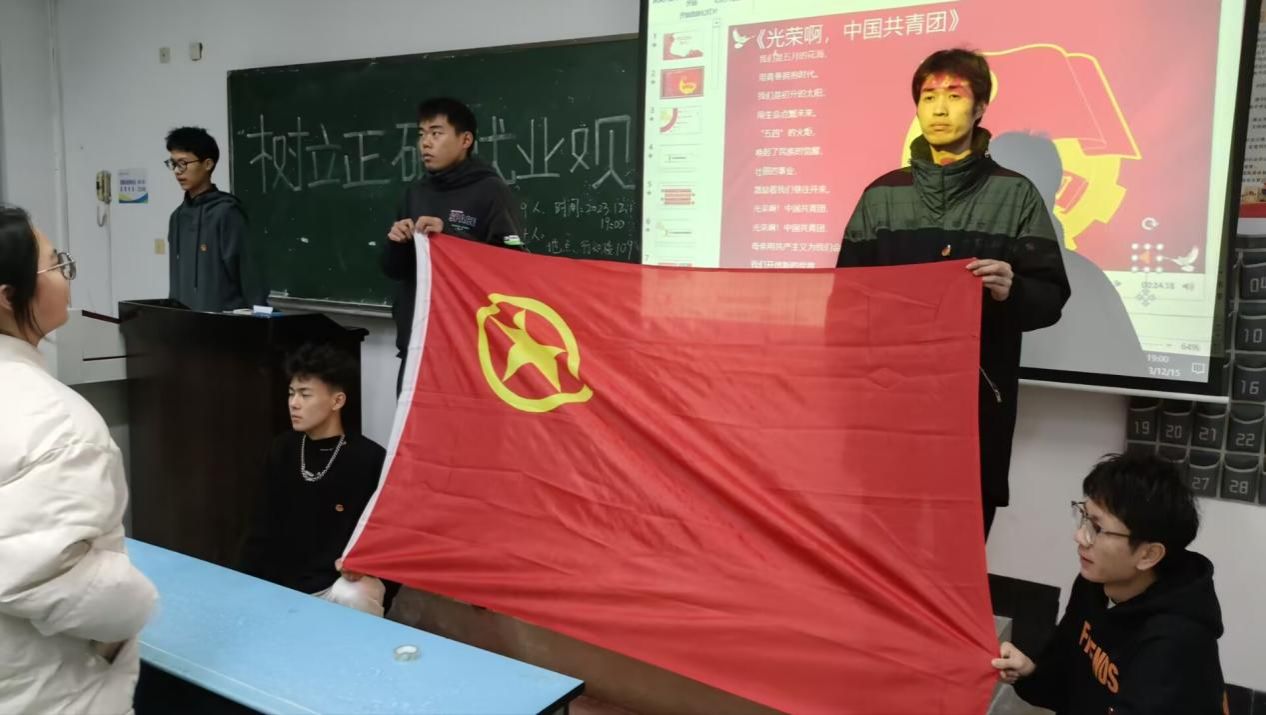 在团支书介绍了此次团课主题后,进行团课第二项,全体肃立迎团旗唱团歌。随后,以“树立正确的就业观”为主题,向同学们普及了一些相关知识,强调要深刻认识新时代新征程的战略安排,并鼓励同学们不仅要提升自身理论知识和政治素养,还要树立正确的理想信念和价值观,这一点对于青年人来说尤为重要。紧接着,团支书强调要树立正确的就业观,提高自身竞争力。随后,各班学员代表发言,谈他们对强国复习的深刻理解,提到只有不断学习和实践,才能更好地肩负未来的责任和使命。在团课开展期间,各位团支书的提问得到了同学们积极回答。最后,各位团支书总结了此次团日活动学习的内容并宣布此次团日活动圆满结束。