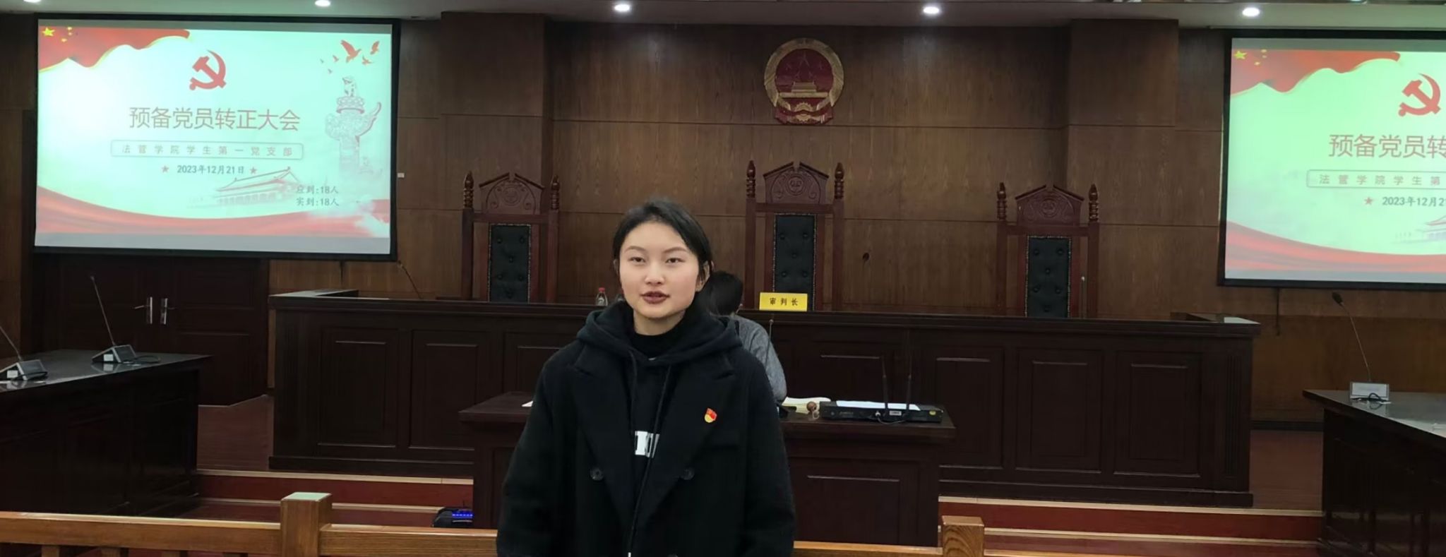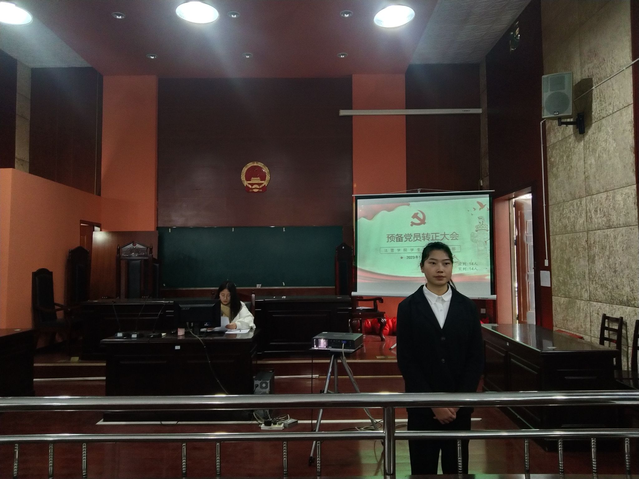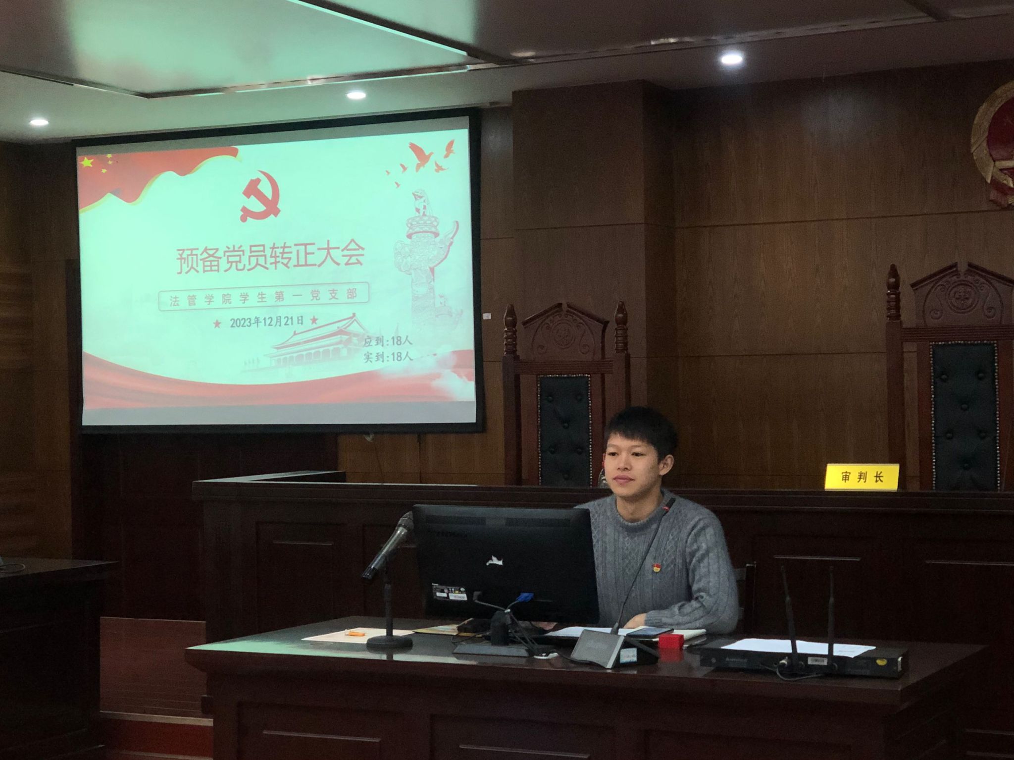 本网讯(文/何叶 图/秦春艳)为进一步加强党员队伍建设,增强党员队伍的生机和活力,法管学院学生党支部于2023年12月21日在模拟法庭召开预备党员转正大会,法管学院指导党员主持本次大会,法管学院学生党支部全体预备党员参加本次会议。