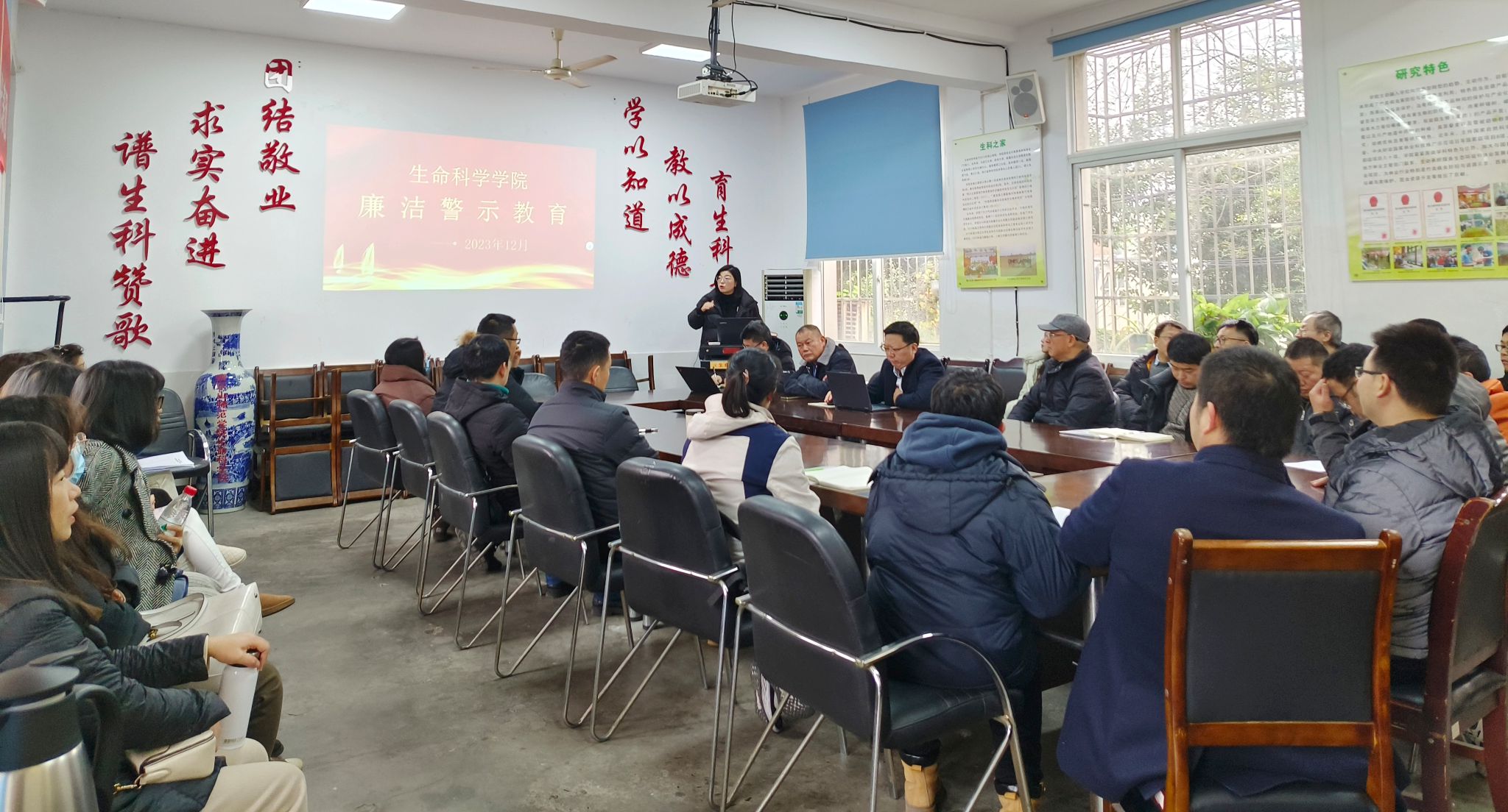 本网讯(文图/罗旭、易秀琴)为深入学习贯彻习近平新时代中国特色社会主义思想,加强新时代廉洁文化建设,切实推动廉洁教育走深走实,进一步增强教职工廉洁自律意识,筑牢拒腐防变思想堤坝。12月21日下午,生命科学学院党委在博雅楼一楼会议室开展廉洁警示教育活动,活动由学院党委书记杨益主持,学院全体教职工参与。
