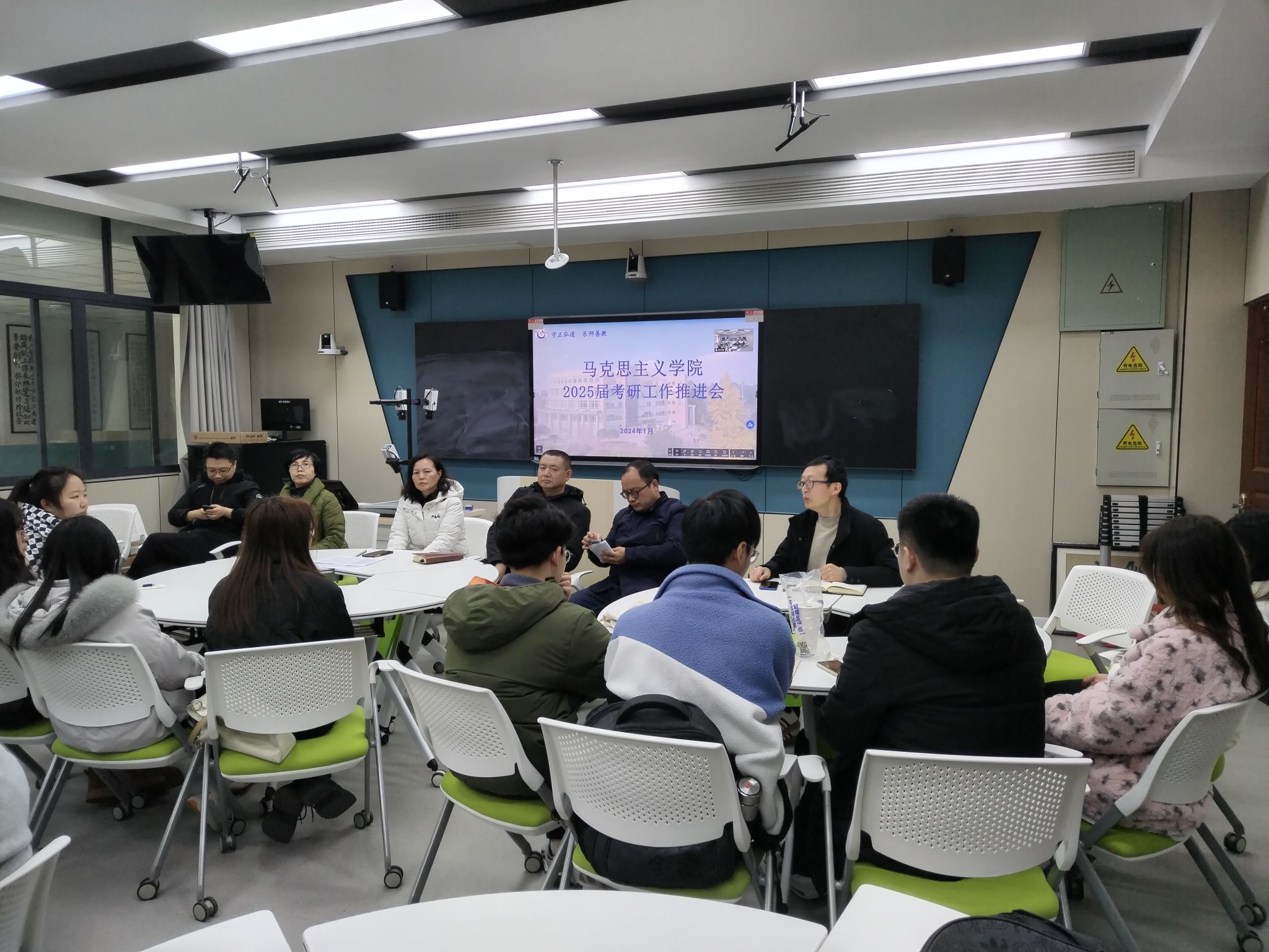 本网讯(文/尹桐 图/付玲欣)为进一步促进和强化全院学生学习的积极性,创造好学、乐学、上进的学习氛围,加强同学们对考研的认识和了解,帮助同学们明确考研的奋斗目标。1月5日,马克思主义学院于实训楼B104教室开展2025届考研工作推进会。学院党委书记李涛,院长郑文杰,党委副书记、纪委书记钟永淑,副院长蒋政、赖伟,思想政治教育系主任官远程,专任教师韩俊和辅导员张红丽出席会议,2021级60位准备考研的同学参加,本次会议由钟永淑主持。