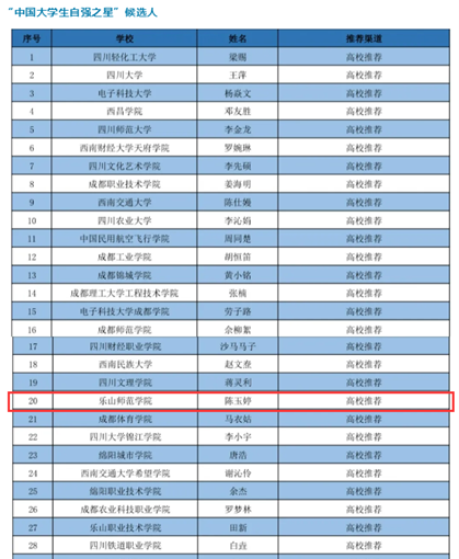本网讯(文/陈聪、李智瑶 图/陈玉婷)4月18日,2023-2024年度“中国大学生自强之星”奖学金四川省拟推荐人选名单公示,我院21级会计二班的陈玉婷同学成功入选。2023-2024年度“中国大学生自强之星”奖学金推报活动由共青团中央、全国学联指导,共青团中央基层建设部、中国青年报社、新东方教育科技集团、中国青年创业就业基金会联合举办。活动以“自信自强挺膺担当”为主题,旨在树立当代大学生中热爱祖国、品行优良、不畏艰难、自强不息的榜样。