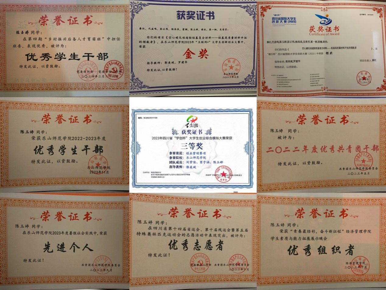 陈玉婷在大学期间成绩排名和综合排名始终位于本专业前10%,获得了校设奖学金,并且成功考取了1+x职业技能等级证书、英语四级、普通话二级乙等等证书,同时在国家级期刊上发表了学术论文。在专业实践能力方面,获得四川省“学创杯”大学生创业综合模拟大赛中获得四川省三等奖、“建行杯”四川省国际大学生创新大赛省级银奖、2023年“挑战杯”黑科技专项比赛全国特等奖、世界杯葡萄牙vs加纳波胆预测 互联网+创新创业比赛一等奖等。