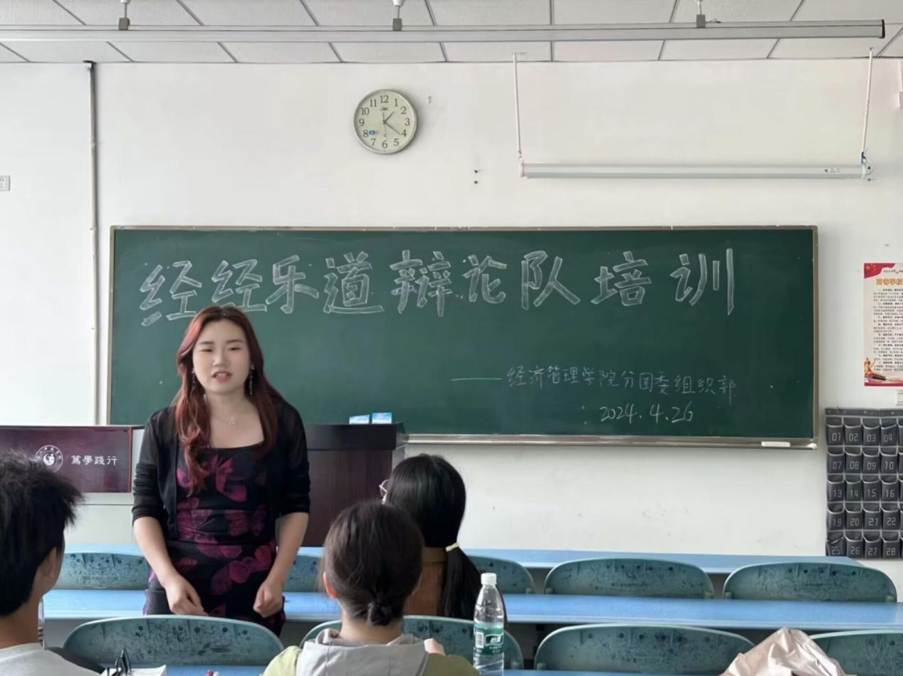 本网讯(文/高瑞 图/赵钰婷、邵雨凡)4月26日,由经济管理学院分团委组织部主办的“经经乐道”辩论队培训日常训练在行知楼117教室顺利开展,本次日常训练由经济管理学院分团委组织部副部长邢焕英主持,22级、23级经管辩论队队员参加了本次活动。