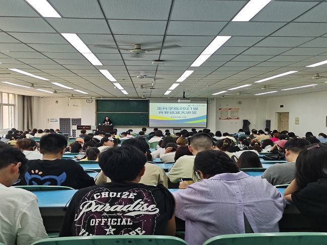 本网讯(文/龙闰 图/景秋菊)为进一步营造2021级学生良好的学习氛围,生命科学学院辅导员曹力欢在行知楼125教室为2021级全体同学开展“青春就业大讲堂”活动。