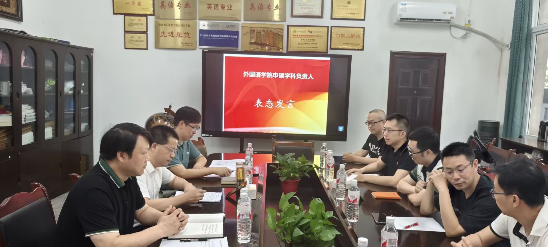 本网讯(文/廖百秋 图/雷洪敏)7月13日上午,外国语学院在学院304会议室召开了2024-2025年重点学科骨干教师聘任会。本次会议由外国语学院副院长陈开富主持,外国语学院党委书记袁明锋、院长江世勇,学科英语、翻译两个优先培育学科骨干教师参加了会议。
