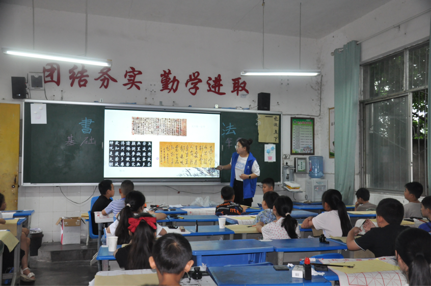 本网讯(文/向奕 图/欧洋洋)7月9日,校园被轻纱般的烟雨笼罩,朦胧而神秘,为即将展开的志愿活动平添了几分诗意与期许。今日,美术与设计学院的志愿者们继续肩负使命,于简陋而充满生机的乡村教室中,开设手工美术班,而书法,以其独有的风韵,成为了今日教学舞台上的璀璨主角,引领志愿者与乡村孩童共赴一场传统文化的深度探索之旅。