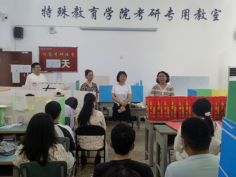 本网讯(文、图/朱以荣)为了解关心特殊教育学院2025届考研学子暑期留校复习备考情况,帮助我院考研学子缓解备考压力,鼓舞士气,8月5日上午,学院院长张梅、副书记兰芳、副院长魏欣等一同前往学院考研自习室慰问2025届暑期留校的考研学子。