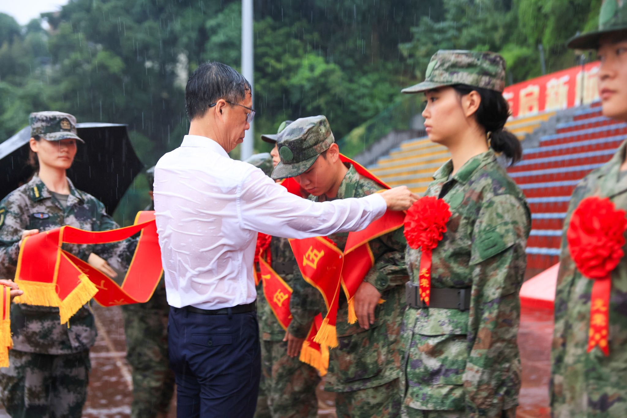 伴随着激昂的进行曲,担任本次军训教学任务的53名武警乐山支队官兵踏着雨水、迈着整齐划一的步伐入场,挺拔的身姿、昂扬的斗志瞬间点燃全场氛围。暴雨中,军训团参谋长、武警乐山支队少校副参谋长刘志勇为军训连授旗,战旗猎猎,更显庄严。
