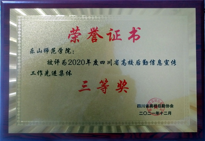 本网讯(文、图/代成刚)12月6至8日,四川省高校后勤协会2020年度信息宣传表彰会暨通讯员培训会在成都召开。会议由四川省高校后勤协会秘书长高庆主持。四川省教育厅领导、省高校后勤协会领导分别作重要讲话。会上,乐山师院荣获四川省高校后勤信息宣传工作先进集体三等奖。