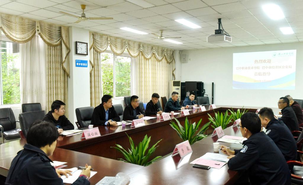 本网讯(文/杜鸿 图/徐凌云、薛小丽)3月24日,巴中职业技术学院院长助理吴祖秧一行到我校考察交流警务室建设、安全保卫管理及具体措施等相关工作。校党委常委、副校长李朝晖热情接待了吴祖秧一行,并在弘毅楼207会议室开展交流座谈。乐山市公安局市中区分局海棠派出所所长车慈威、驻校民警李毅,校党委武装保卫部副部长罗刚、梁光德,安全保障中心主任张志强陪同。