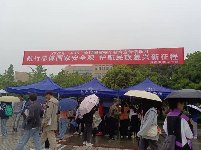 早上十点,同学们陆续来到桂花广场,尽管空中正飘着蒙蒙细雨,却也阻挡不了同学们对国家安全的关注和参与活动的热情。广场上人来人往,在现场工作人员的引导下,同学们都纷纷领取了《中华人民共和国国家安全法》知识手册和《国家安全法律知识手册》,并认真翻阅。随后,同学们还仔细浏览了提前设置在广场上的有关国家安全知识的宣传带,从中了解到国家安全的概念、公民维护国家安全的义务、日常生活中对身边可疑人员的注意事项等相关知识。最后,在工作人员的号召下,同学们拿起手中的笔,在“国家安全从我做起”的条幅上庄重写下自己的名字,并表示将严格践行这一承诺。