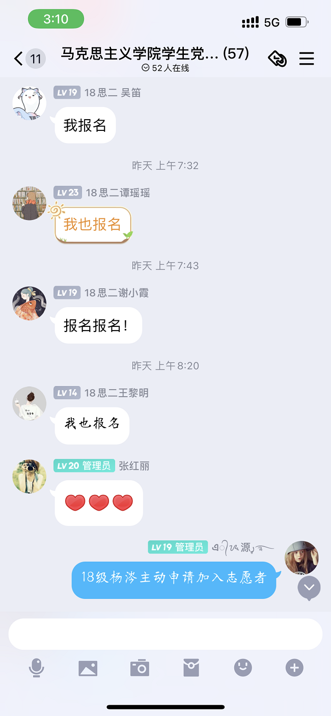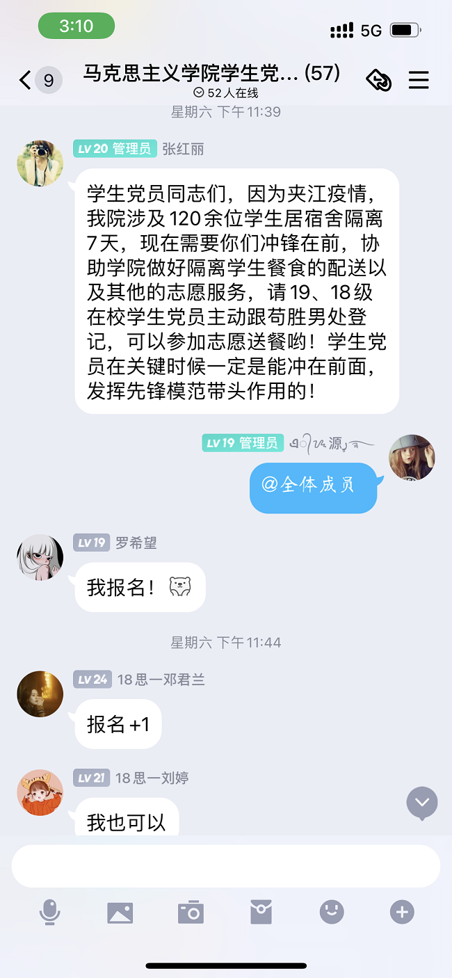 此外,一句句“我报名”、“我也报名”……的消息闪烁在马院学生党支部群里,学生党员积极主动报名参与疫情防控,冲锋在前,发挥先锋模范作用。各班级学生也主动申请加入志愿者队伍,希望可以为隔离的同学贡献自己的一份力量。