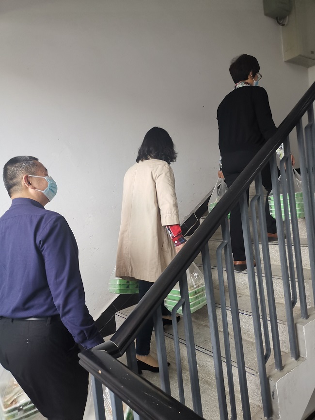 在此期间,我院党政领导班子时刻关注被隔离同学的生活学习状况,5月16日中午,院长郑文杰、院党委书记李涛、副书记钟永淑他们带头开展服务,为隔离的同学送去饭菜,确保同学们的生活得到保障。