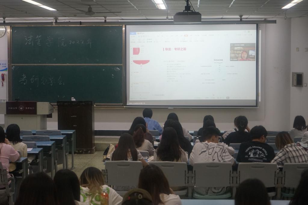 本网讯(文、图/钟宇桐)为给2023届考研学子们提供指导服务,抓早抓细做好考研动员工作,增强考研信心,2022年5月22日晚,法学与公共管理学院在行知楼114召开了2023届考研工作动员会,会议邀请了四川大学马克思主义学院在读博士、2007级思想政治教育专业宋淑梅师姐主讲,法管学院党委副书记周琴、辅导员何叶、2023届考研学子及20、21级有考研意愿的同学共同参加了本次活动。