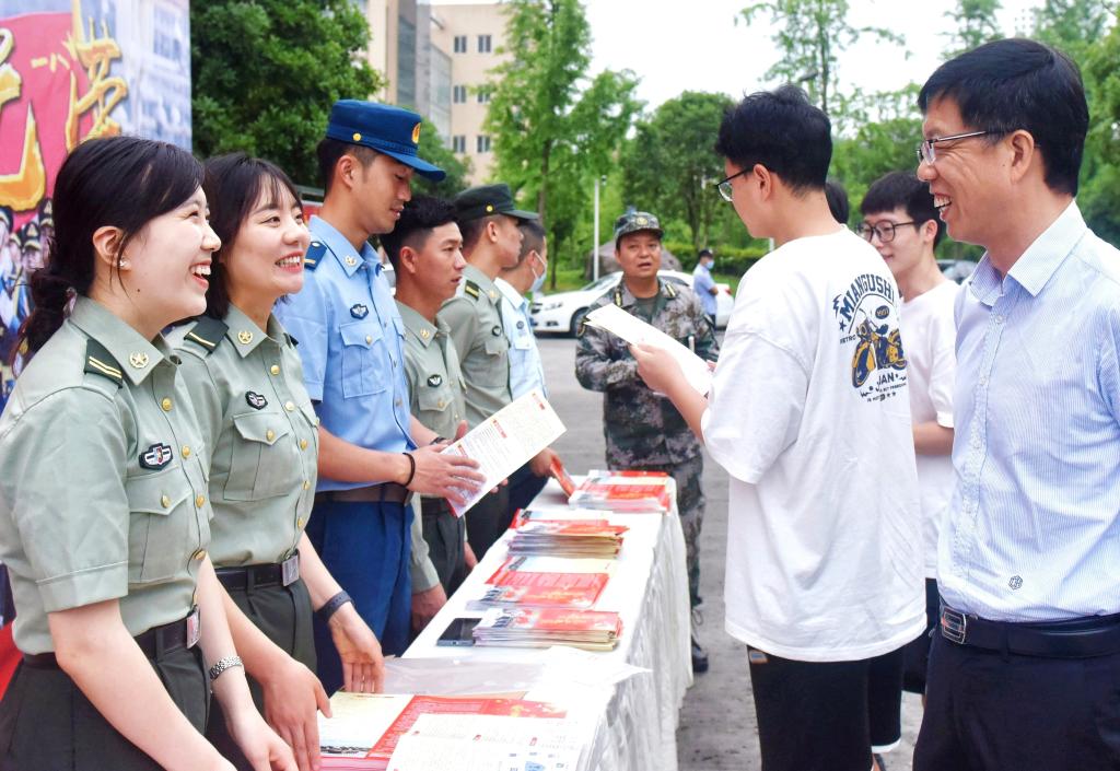 本网讯(文/周子崴 图/徐凌云)5月27日,我校在北校区桂花广场隆重举行2022秋季征兵宣传走进校园双选会活动。卡塔尔世界杯决赛波胆预测 党委常委、副校长李朝晖出席了活动,乐山市市中区武装部政委赵辉、保障科科长张凯莅临现场指导,卡塔尔世界杯决赛波胆预测 征兵工作站武装干部以及优秀退伍大学生代表参加了活动。