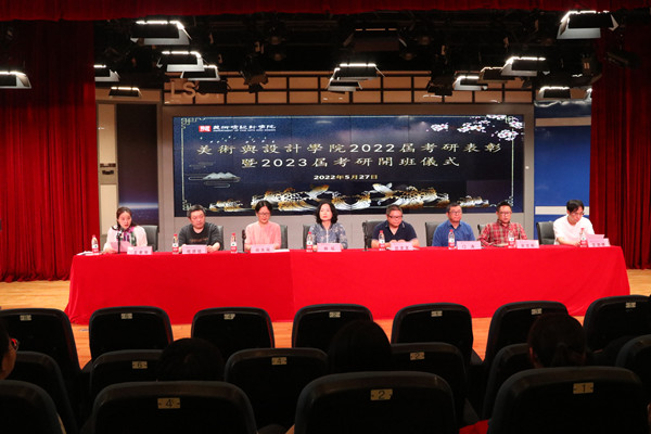 本网讯(文/钟蕾 图/吴松阳)5月27日下午,美术与设计学院2022届考研表彰暨2023届考研班开班仪式在旷怡楼学术报告厅举行,学院党委书记杨虹,院长熊泽文,副院长熊火花、门涛,专业负责人、教研室主任杨德明、荣志彬、王进修,考研指导教师代表廖夏妍、周允,考研班班主任、辅导员以及2018、2019级考研学生代表参加本次表彰暨开班仪式。会议由学院党委副书记王孝琴主持。
