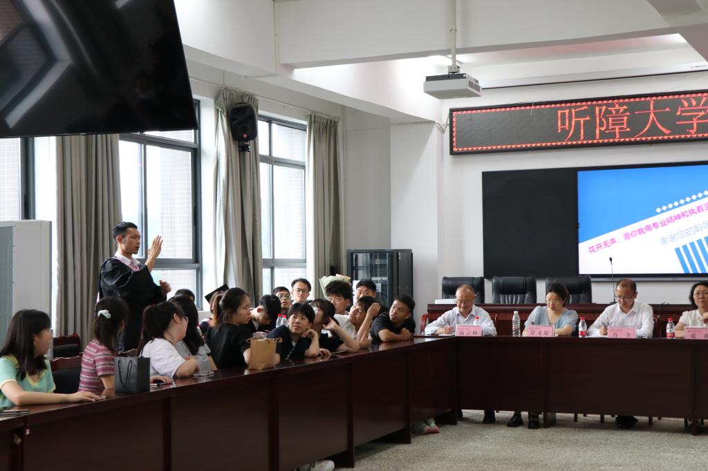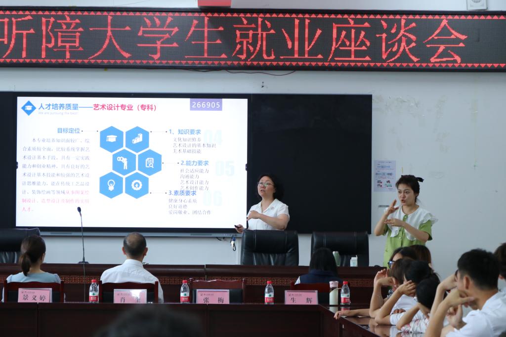 会议上,张梅向各位领导、学生和家长汇报了特殊教育(本科)、艺术设计(3+2专科)、服装与服饰设计(3+2专科)三个专业的培养目标、课程设置、招生情况、主要就业单位、优秀学生及作品等情况,并对我院听障大学生人才培养现状进行了介绍。