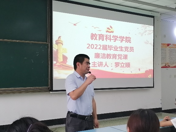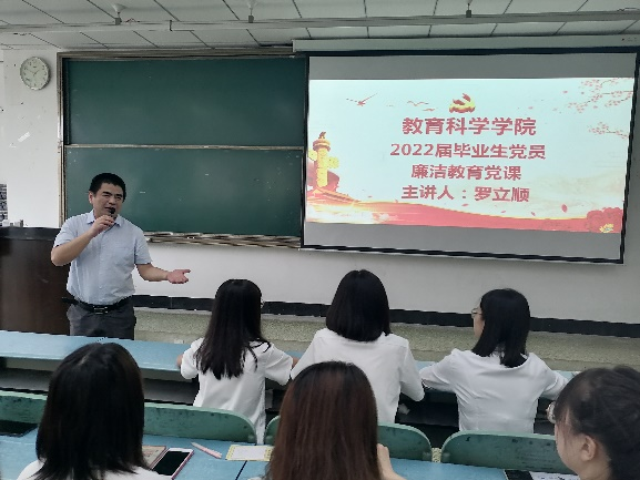 本网讯(文、图/陈安祺)为进一步加强毕业生党员廉洁意识,筑牢反腐倡廉的思想底线,教育科学学院6月15日下午在行知楼125教室组织了毕业生党员廉洁教育党课,党委书记罗立顺为党员们授课。