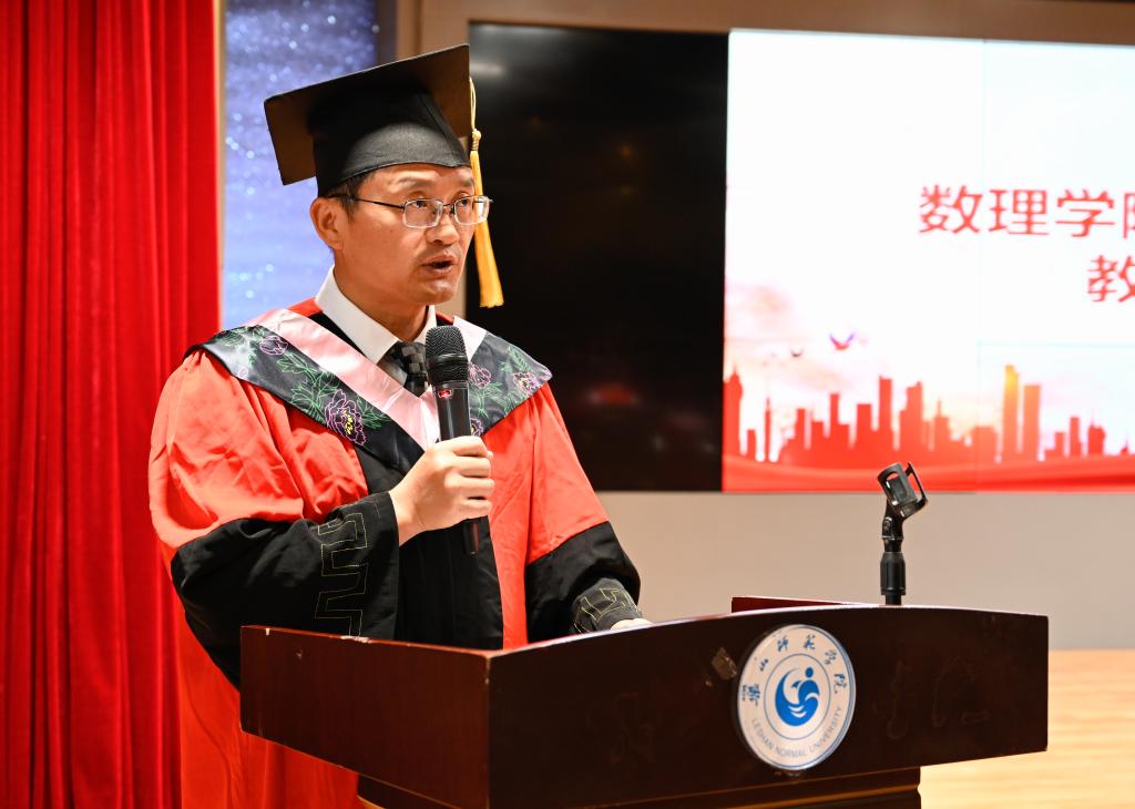 屈小兵致辞,他代表数理学院全体师生对2022届毕业生表示由衷的祝贺,并给予了三点嘱托:一是勇立远大志向,永远与时代主题同心同向;二是铸就卓越才能,永远持有核心竞争力;三是发扬吃苦耐劳精神,永远保持优秀品格。随后,在欢快的授位音乐中,屈小兵、黄凯、孙海、李洪恒、肖啸、贾礼平、于恩锋、石凯八位老师为全体毕业生拨穗正冠,授予学生学士学位。