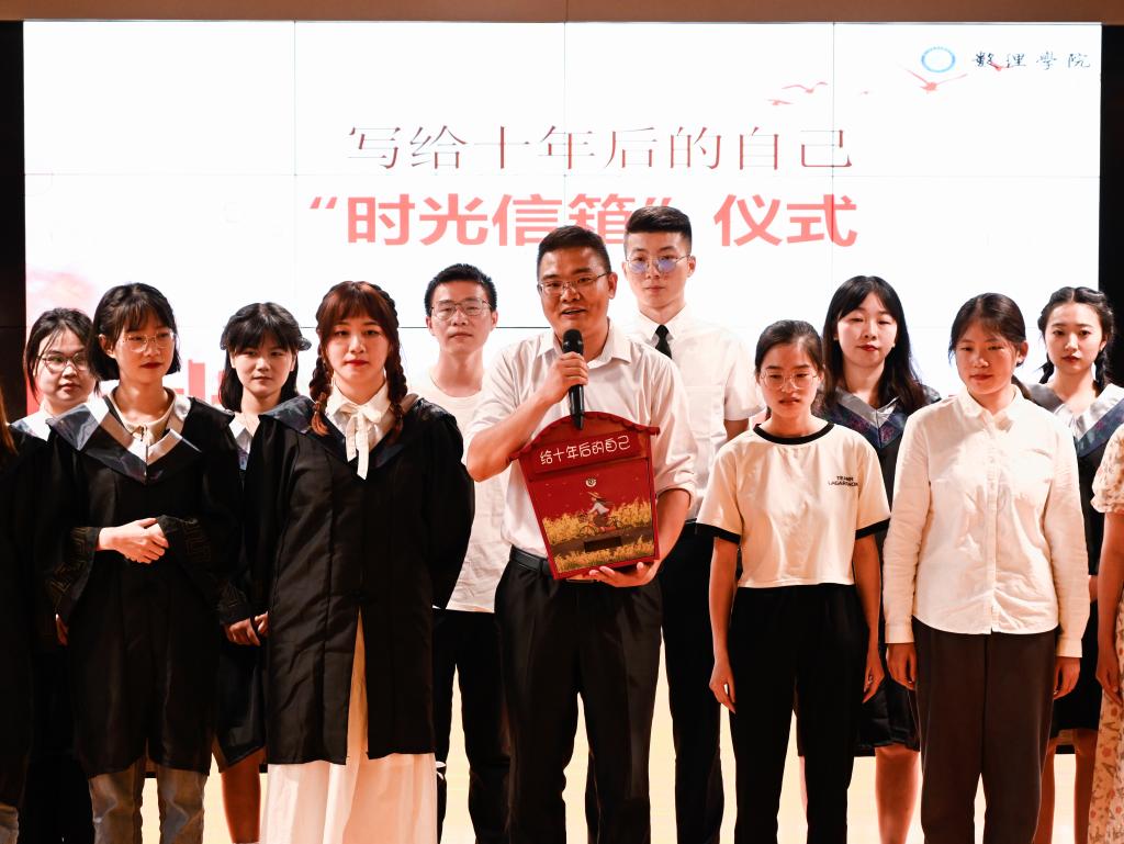在欢送仪式环节,青春纪念相册的播放,让毕业生们重温了自己温暖而幸福的四年青春岁月,四年的收获与美好的祝福都定格在一张张照片、一句句祝福、一幕幕画面里。随后,教师代表李洪恒、黄凯、贾礼平、于恩峰、石凯先后发表毕业寄语,祝愿各位毕业生前程似锦,鹏程万里。即将别离,离别之情溢于言表,毕业生代表梁敏、邓子瑜、钟裕、罗艺桐、闫艺如五位毕业生上台发表了毕业感言,真情实感地讲述了自己大学四年的收获,表达了对母校的美好祝福,对老师的感激,对同学的依依不舍。在“时光信箱”环节,“写给十年后的自己”这封信承载着毕业生对未来的满满期许和美好愿景,时光信箱守护人、辅导员陈盈舟老师回顾了和同学们朝夕相处的四年,并将最美好的祝福送给了即将离别的他们。