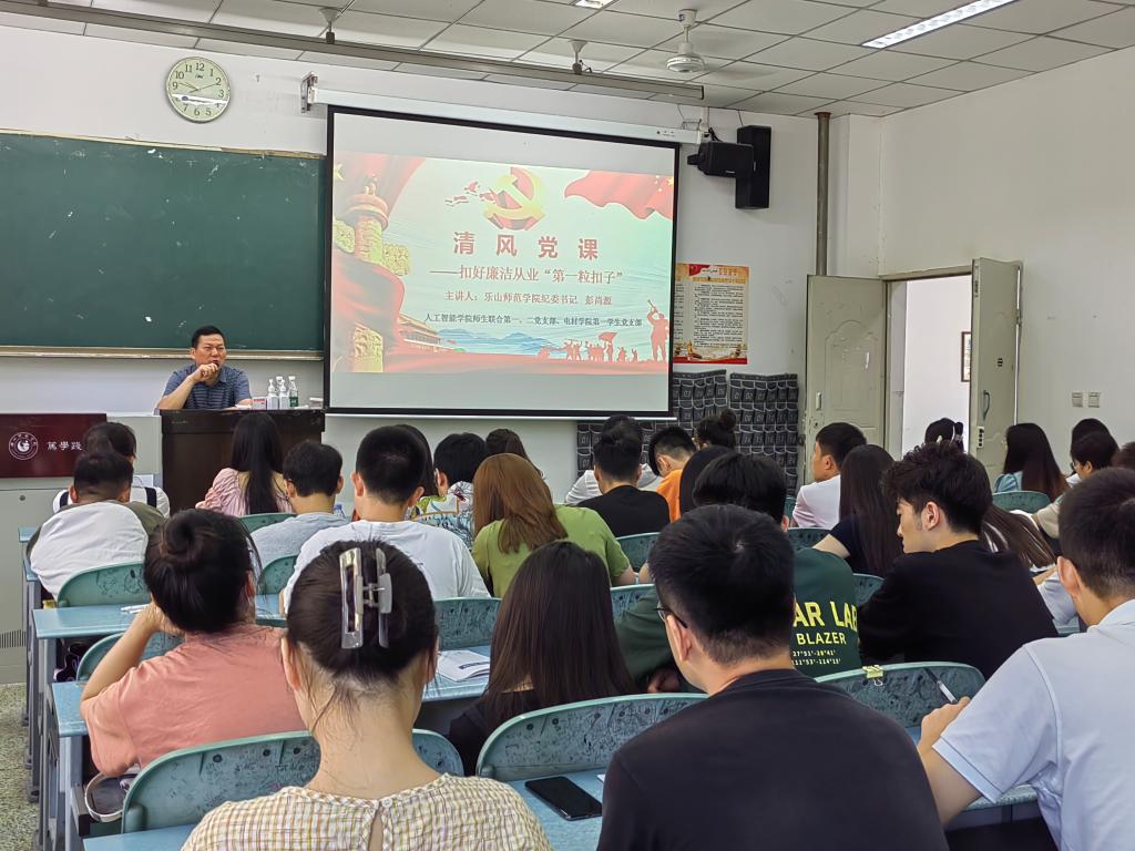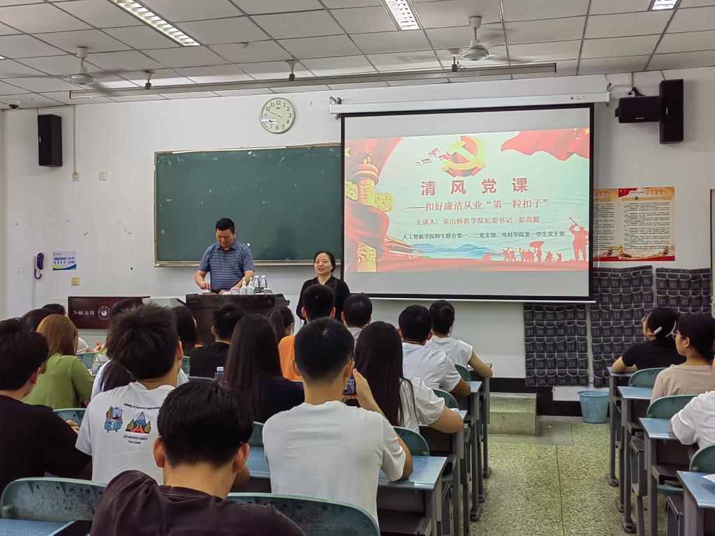 本网讯(文/陈泓霓,图/肖如雪)近日,为扎实推进党风廉政教育,增强毕业生党员廉洁自律意识和能力,人工智能学院师生联合第一、二党支部和电子与材料工程学院第一学生党支部特邀校党委副书记、纪委书记彭尚源在行知楼110教室担任主讲开展清风党课的学习,参加此次党课的有师生联合第二支部书记谭红梅、党建辅导员雷雄锴以及2022届全体毕业生党员。