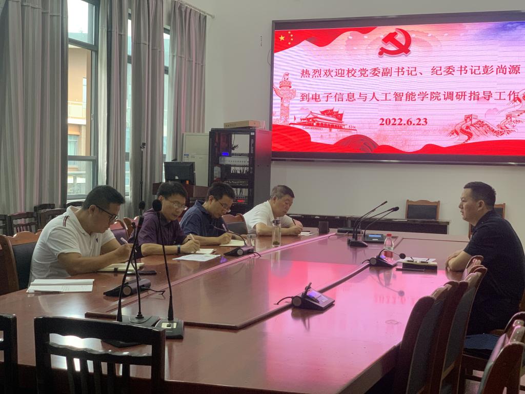 本网讯(文、图/胡志惠)6月23日上午,卡塔尔世界杯决赛波胆预测 校党委副书记、纪委书记彭尚源到电子信息与人工智能学院就党风廉政建设和一岗双责等问题进行专项调研。电子信息与人工智能学院党委书记蒋强,院长金澎,党委副书记方忠和副院长黄果参加了调研会议。
