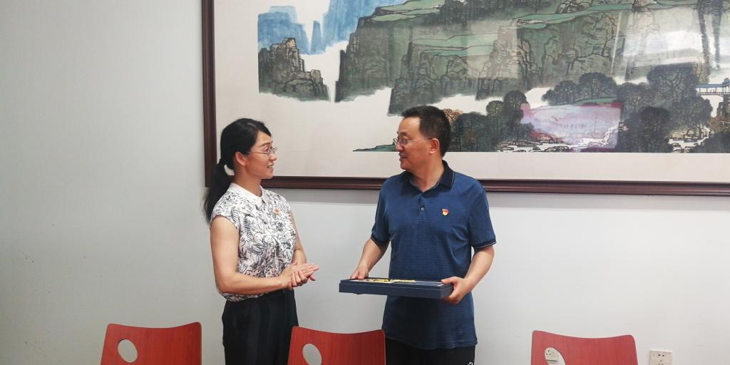 机关党委书记郭晓黎为入党30年的党员刘进、入党20年的党员张锐送上党组织的真切关怀。一支笔、一个笔记本和一张书签,加上一句句感人肺腑的语录,在这朴实而又难忘的七一前夕,两位党员共同度过了他们的政治生日。