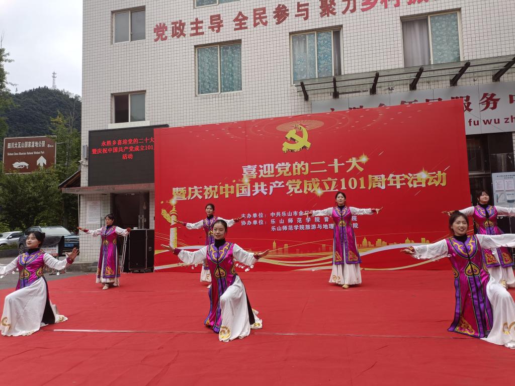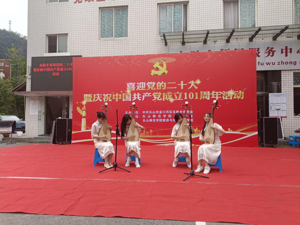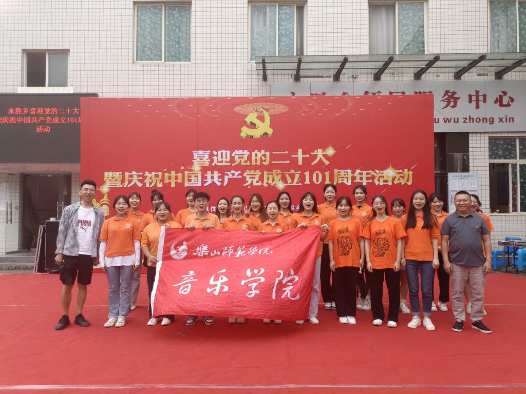 本网讯(文、图/罗智勇)文艺下乡,百姓称赞;实践成员,青春飞扬。2022年6月30日,音乐学院和旅游与地理科学学院暑期社会实践文化艺术服务团30人前往金口河区永胜乡开展文化艺术服务活动。本次活动以“喜迎二十大、庆七一”和“宣传国家、省民族政策”为主题,以学生志愿者为依托,鼓励大学生下基层,知民情,宣传民族政策,为当地村民带去丰富多彩的文艺表演。活动全程成果显著、形式多样、宣传及时。得到了当地领导和村民的一致赞赏,同时也受到了当地媒体的关注及相关报道。