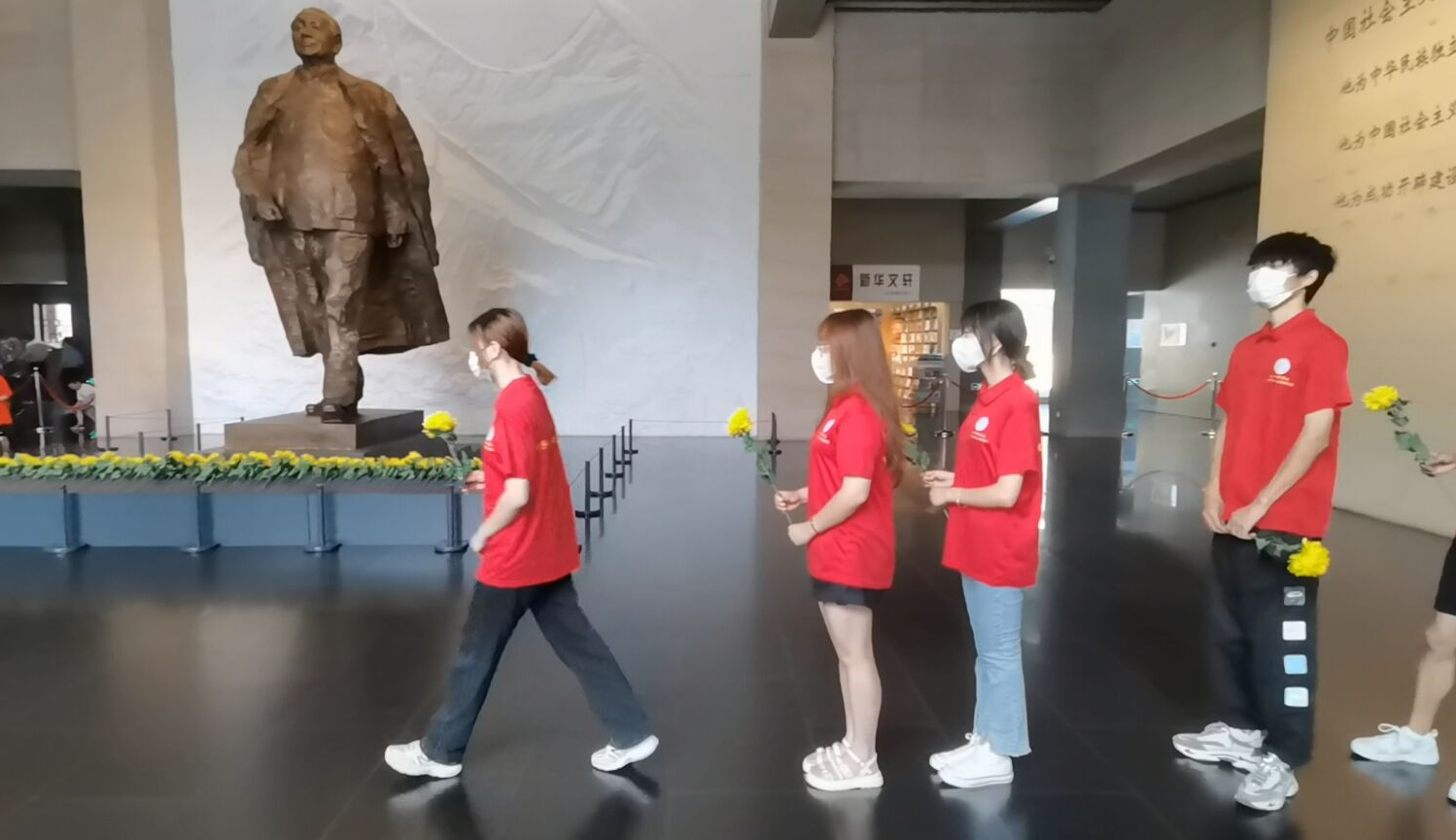 遵照疫情防控要求进入邓小平爷爷纪念馆之中。随后,学习小队穿过铜像广场,邓小平陈列馆,小队全体队员在邓小平雕像前鞠躬致敬和敬献鲜花。