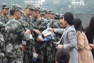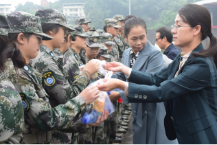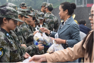 (老师学生为受训新生分发慰问品)