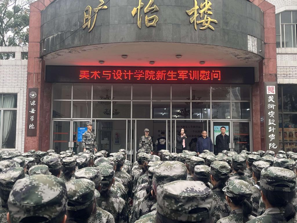 本网讯(文/刘桐江 图/杨柳)10月26日下午,美术与设计学院在旷怡楼进行新生军训慰问,党委书记杨虹、院长熊泽文、党委副书记王孝琴、副院长何川、新生班主任、辅导员出席,面向全体22级军训新生、美设学院学生教官进行慰问。