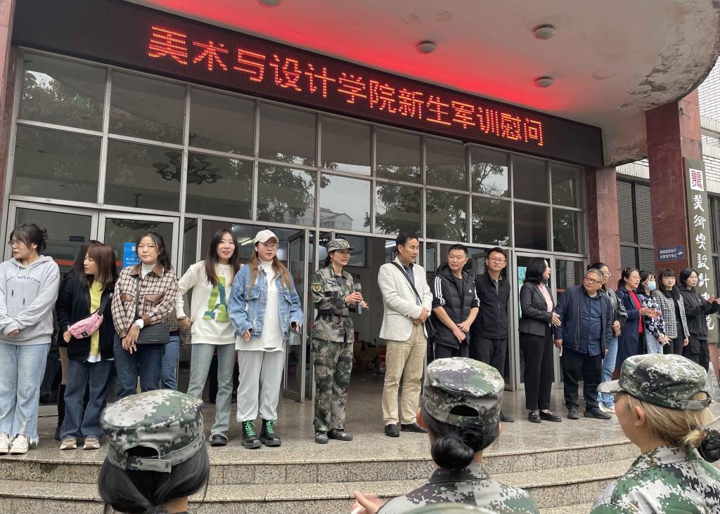 杨虹在同学们的热烈掌声中表达了全体院领导、老师对军训新生的关心和慰问,肯定了军训至今同学表现出的吃苦耐劳、不畏艰难的良好品格,展现了美术与设计学院昂扬向上的精神风貌,并预祝大家在最后的军训汇报演出中取得优异的成绩。王孝琴希望同学们在接下来的训练中继续保持高昂的热情,强健体魄、磨砺意志,培养健康的作息规律。最后老师们一同为同学们亲手送上慰问品。