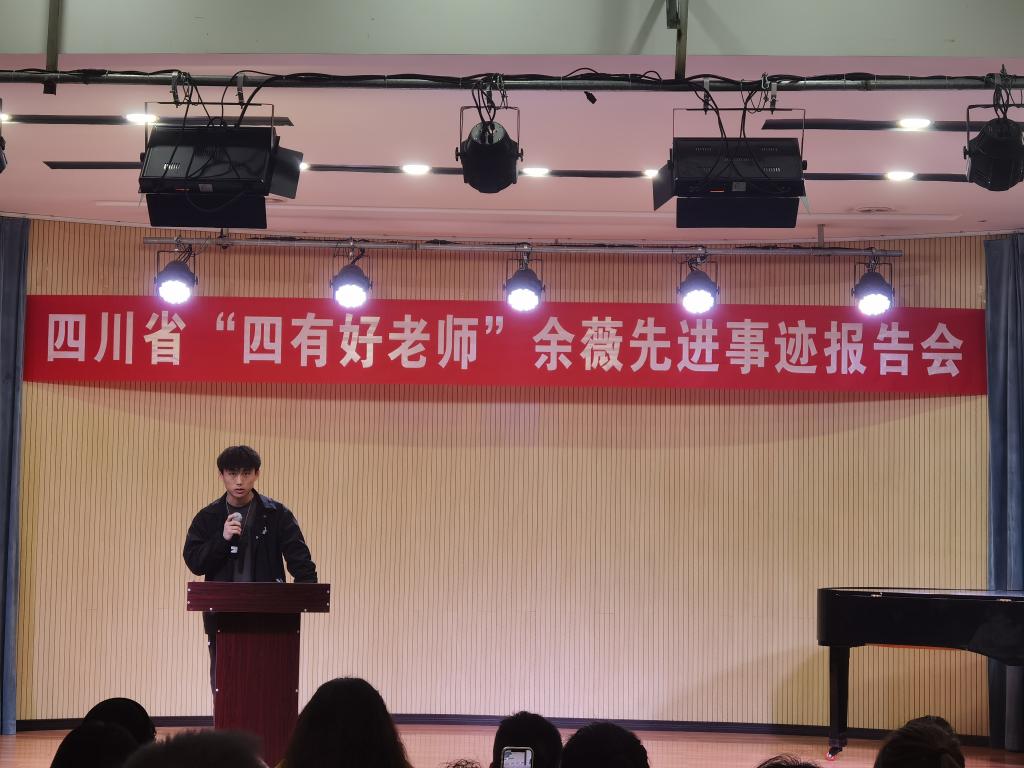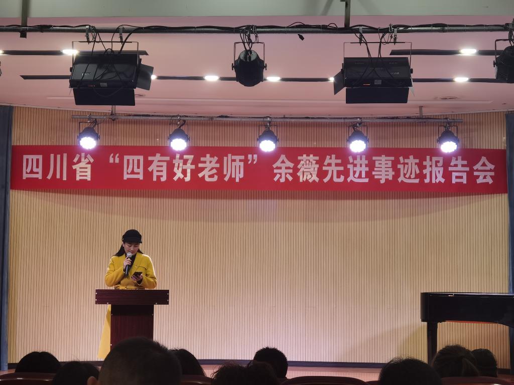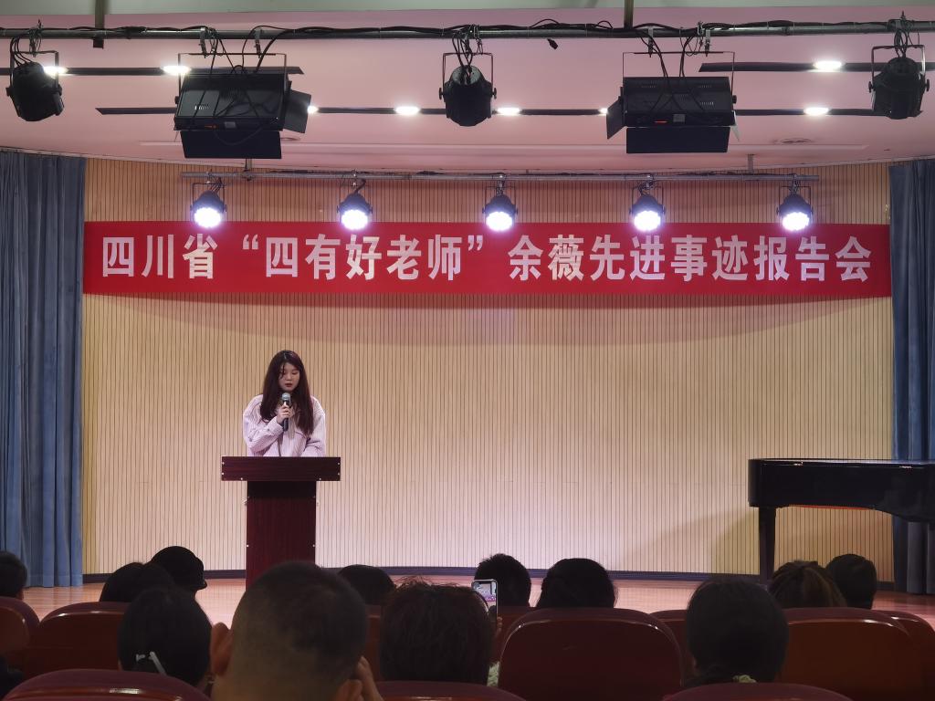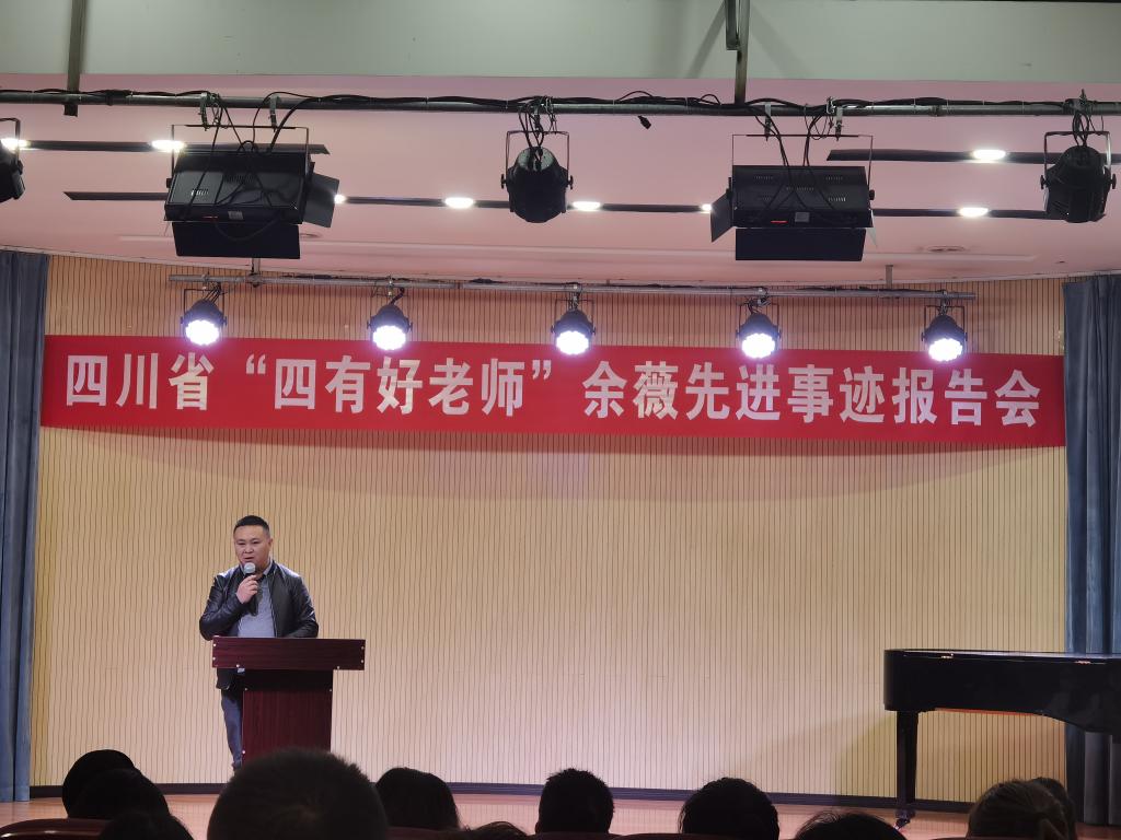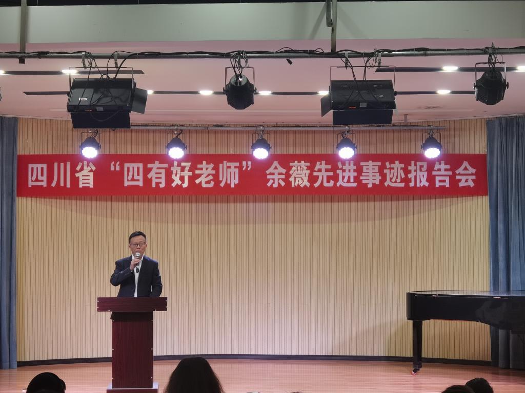 本网讯(文/毛敏、图/李志翔)2022年10月27日下午,音乐学院组织开展“学习优秀教师事迹、争做‘四有’好老师”师德教育活动,以四川省“四有”好老师余薇先进事迹报告会的形式,用身边人讲身边事、用身边事感召身边人,激励和引导党员、干部和教师学先进、争先进。报告会由音乐学院党委副书记、纪委书记彭瑾主持,音乐学院全体教职工和各年级学生代表参加了报告会,党委书记罗谊恒作了总结发言。