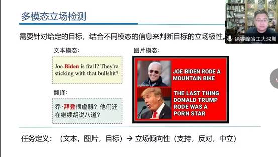 现实生活中,人们对待各种事件通常持有一定的立场倾向性,或支持、或反对,也有保持中立的。立场就是个人或群体对某些特定对象所持有的并公开表达的一种有强烈倾向性的情感。在此次讲座中徐睿峰教授围绕人们的立场展开文本立场检测研究。文本立场检测的主要目的是判别文本对给定对象或话题表达的立场倾向性。其难点首先在于立场表达通常隐含在文本和对象表达的深层语义之中,需要模型对文本和对象进行深度语义理解,乃至借助大量外部知识才能进行准确判别;第二个困难是话题和对象不断产生,因此无法随时构造对应的标注数据集。在本次报告中,重点讨论了有效建模文本和对象/话题关系,以及融合外部知识提高立场检测性能的方法;面向未知对象/话题的零样本立场检测算法,以及面向多模态数据的立场检测方法,实现对文本立场和多模态立场的全面分析。