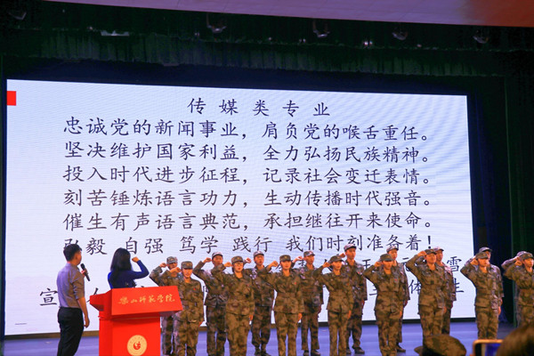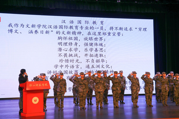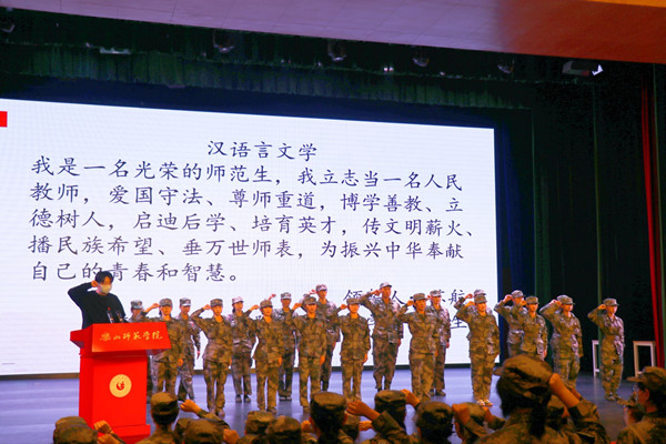 紧接着进行专业教育宣誓。宣誓全过程庄严肃穆,师生们态度端正,认真对待。汉语言文学专业领誓人苏航博士,汉语国际教育专业领誓人陈熹老师,及传媒类专业领誓人王立元、潘雪老师上台,随后各专业新生代表上台,全体新生起立。各专业新生分别由各专业代表老师领誓,大家举起右拳,昂首挺胸,声音洪亮,庄严宣誓,喊出了作为乐师学子奋发向上,砥砺前行的信心与决心。铿锵有力的宣誓,有利于让新生们端正态度,重新审视自身,革新自身,促进自身进步。