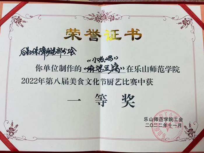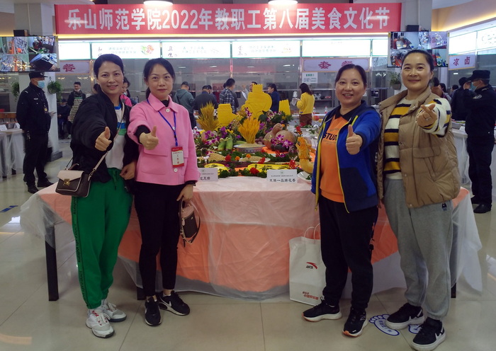 本网讯(文/代成刚、图/代成刚、周玉枝、龚金华)为了打造和谐、健康、文明的校园文化,展示教职工和后勤厨师的厨艺技能,提高全校师生的文化生活质量,由校工会组织开展的乐山师院教职工第八届美食文化节,于11月3日在百果苑学生食堂一楼景苑餐厅如期举行。后保部分工会参赛菜品再次荣获一等奖;后保部荣获优秀组织奖,后保部参赛的菜品中有五个菜品荣获“最受教职工欢迎的十大菜品之一”荣誉称号。