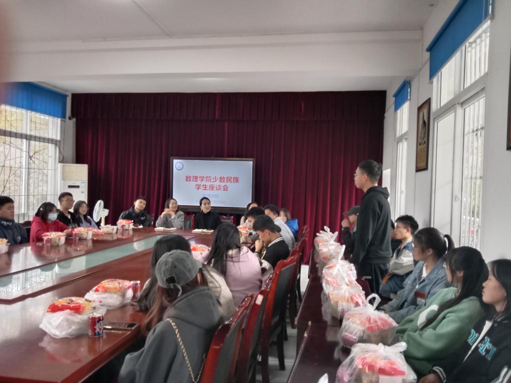本网讯(文/王章琴 图/廖宇)农历十一月,恰逢彝族新年到来之际,为营造浓厚的节日氛围,进一步增进少数民族同学之间的沟通和交流,促进少数民族学生大团结,激励少数民族学生奋发向上,努力拼搏,11月29日中午,数理学院在学院会议室开展少数民族学生座谈会。学院党委副书记左莉,全体辅导员以及彝族、回族、藏族、土家族等50余名少数民族学生参加了会议。