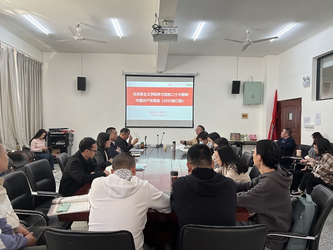 本网讯(文、图/何源)近日,马克思主义学院在实训楼B104室持续开展学习党的二十大精神,学习《中国共产党章程(修正案)》。马克思主义学院党委书记李涛主讲,全体教职工党员参加。
