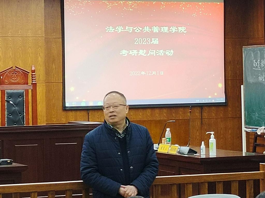 本网讯(文/何叶 图/曾付艳)为振奋法学与公共管理学院2023届级考研学子士气,增强学生备考信心,解答考研学子备考过程中的疑惑。法学与公共管理学院于12月1日下午4点在弘毅楼313教室举办了2023届考研慰问活动,参加的主要领导有学院党委书记程勇、院长苏祥、副院长刘克稳、教务科长张晴、行政管理专业范薇博士、社会工作专业丁木乃博士以及2019级辅导员何叶。
