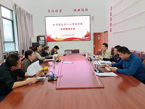 本网讯(文、图/黄陈英)2023年3月30日下午,电子信息与人工智能学院召开学科建设会。本次会议由电子信息与人工智能学院院长金澎主持,蒋强书记、青海银副院长及廖周、陈莉明、张九华、徐美莲、孙锐等骨干教师参加了此次会议。