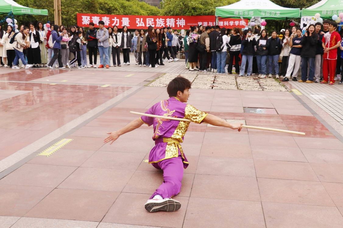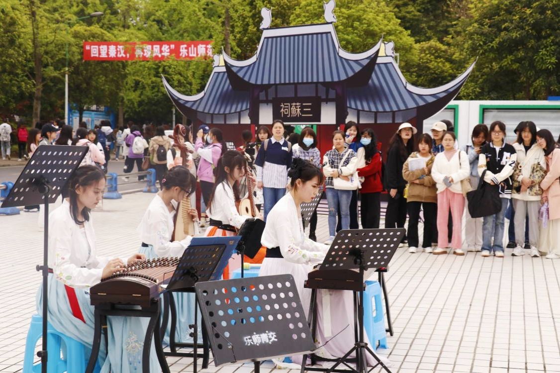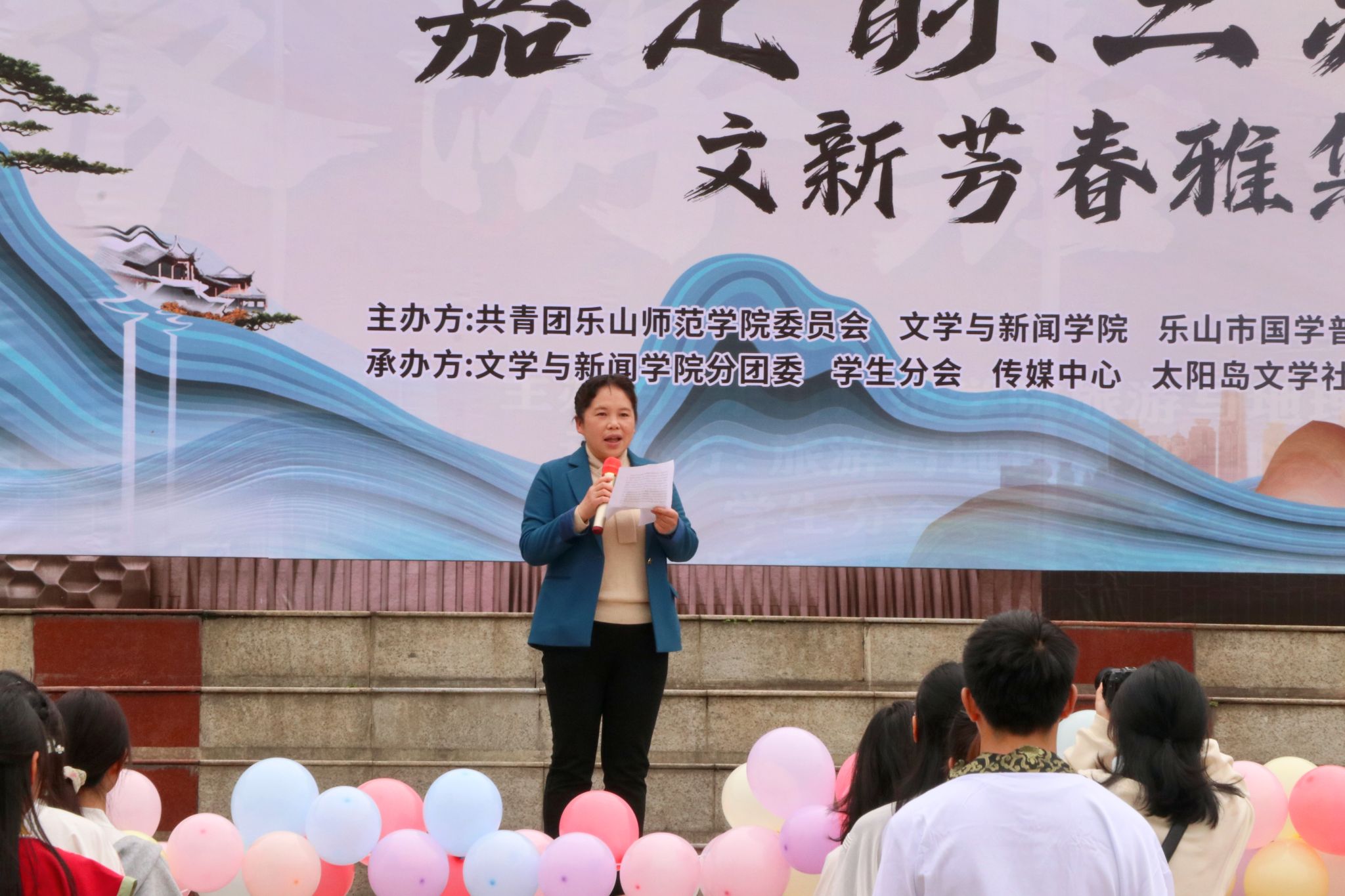 本网讯(文、图/黄鑫垚)为深入学习党的二十大精神,跟随习近平总书记脚步品味“三苏”文化,推进第一课堂和第二课堂深入融合,传承和弘扬中华民族优秀传统文化,增进同学们文化自信。4月7日,由校团委、文新学院、乐山市国学普及基地、经典诵读工作室共同主办,文新学院分团委、学生分会、传媒中心、太阳岛文学社共同承办的“嘉定韵.三苏情”芳春雅集活动在桂花广场成功举办。文新学院党委书记彭杨、文新学院教师代表、辅导员、班主任和全校1000余学生共同参加了本次游园会。