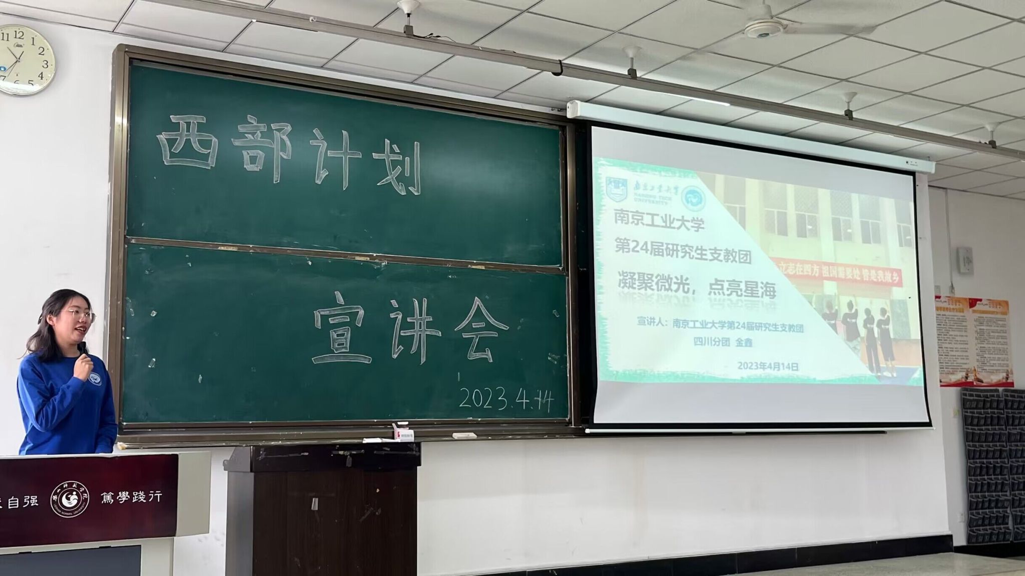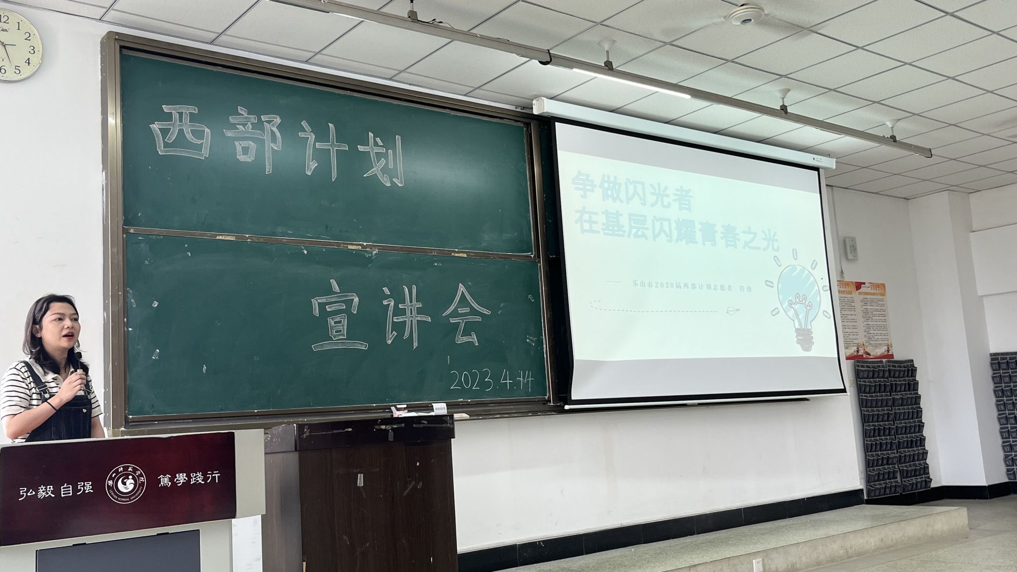 宣讲会上通过生动有趣的动画向毕业班同学描述了什么是西部计划、谁可以参加西部计划、怎么参加西部计划等等。随后袁鑫野向大家具体介绍了西部计划的政策保障,重点介绍了乐山市西部计划项目情况。接着省项目办宣讲团成员金口河金河镇五一村任倩、沐川县黄丹小学金鑫分别分享了他们作为西部计划志愿者在金口河及沐川的经历。任倩分享了自己参与818洪灾防洪清淤、靓在乡村、迎检乡村振兴工作的经历,鼓励同学们走出内卷、远离佛系和躺平,以青春奋斗换不悔人生。金鑫分享了自己在沐川镇黄丹小学的教师经历,为同学们讲述了自己适应环境、提升教学能力、探索教学方法、关注学生成长、整合资源开阔学生眼界的丰富经历。金鑫鼓励同学们在未来教师教学工作中做学生行为习惯养成的引导者,做知识的传播者,做学生成长成才的示范者。
