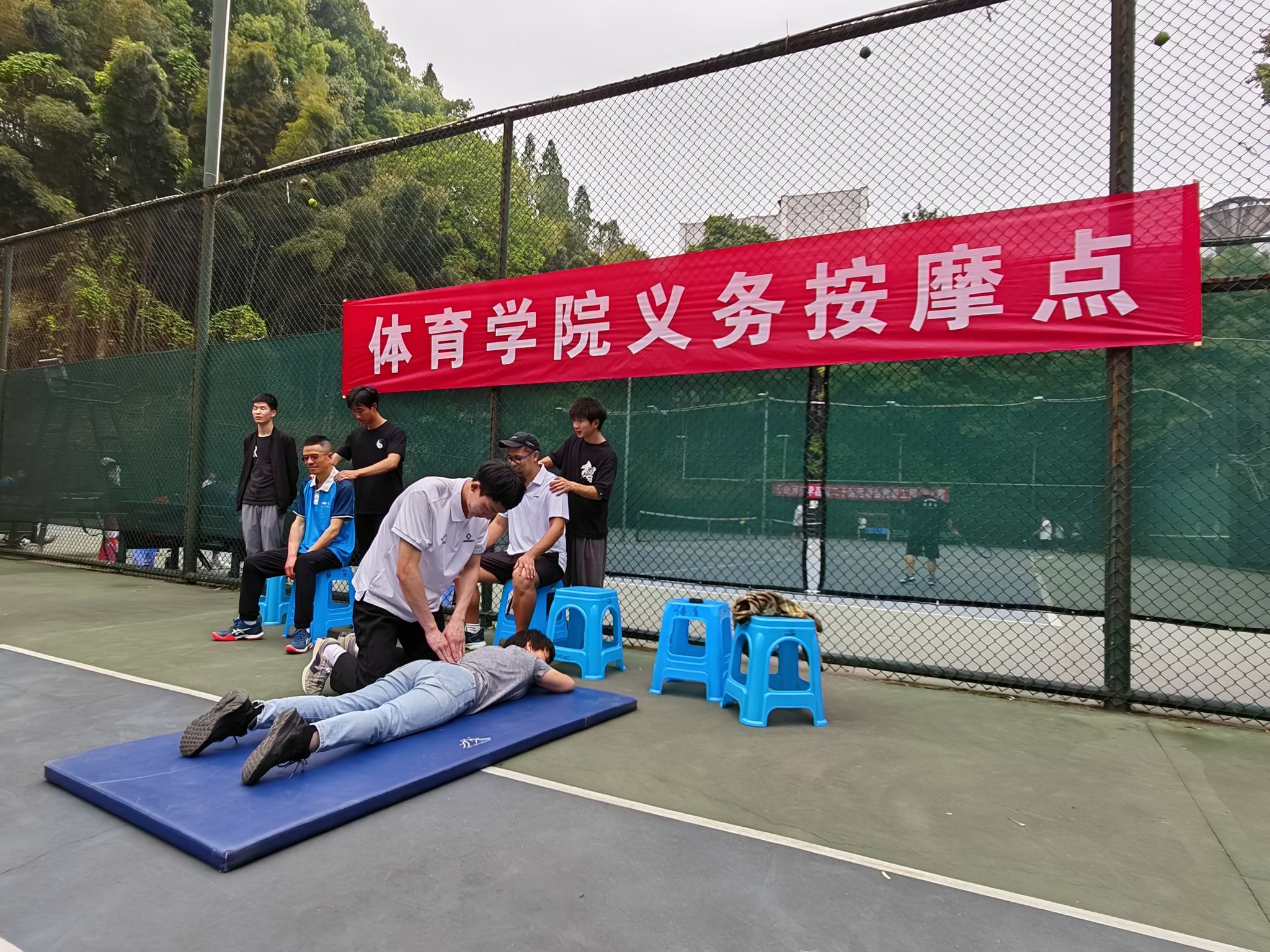 学生党支部组织党员义务按摩队,为全校师生进行义务按摩,帮助师生恢复体能,更好地参加下一轮比赛,展现更好的比赛风貌跟竞技成果。