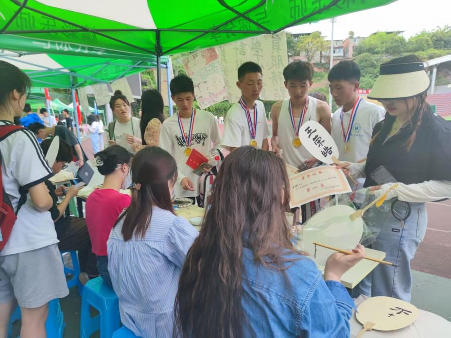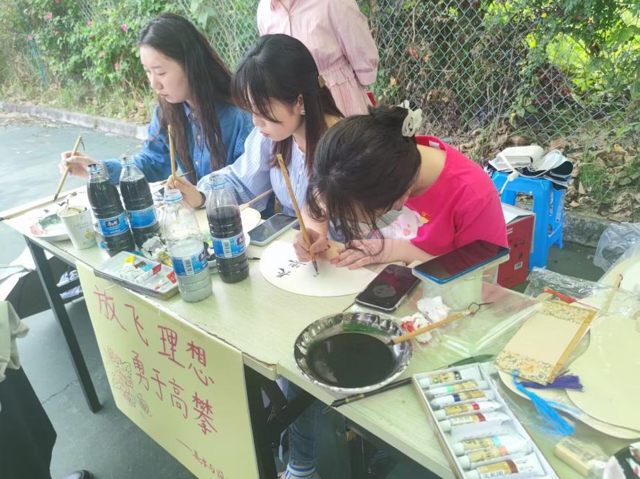 活动中,书法专业学生写字,美术专业学生画画,设计专业学生设计海报和现场服务,数媒专业学生拍摄美好瞬间,同学们根据运动员、老师们的喜好现场制作了百余把风格各异的宫扇。由于活动广受欢迎,同学们还为获得比赛其他名次的运动员书写并赠送书签,祝福他们取得更好的成绩。