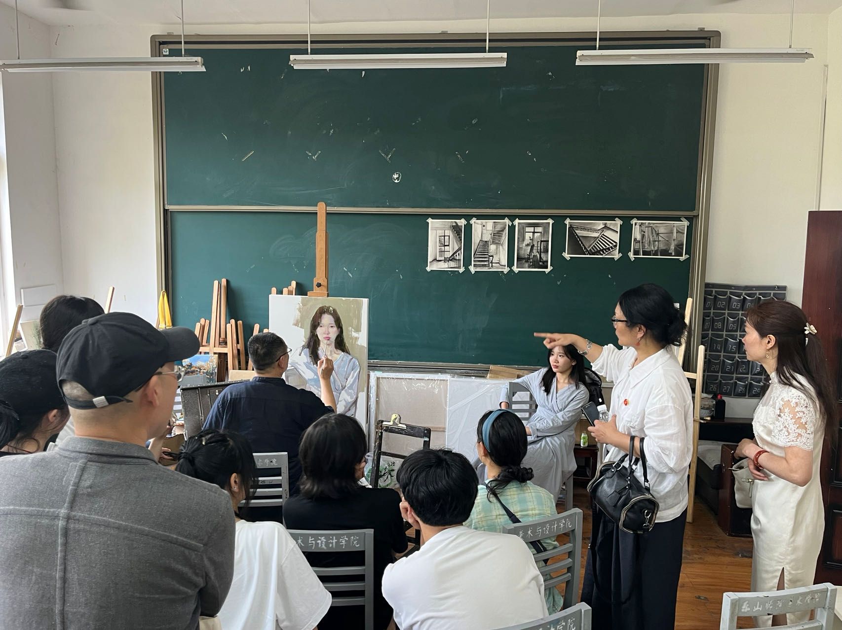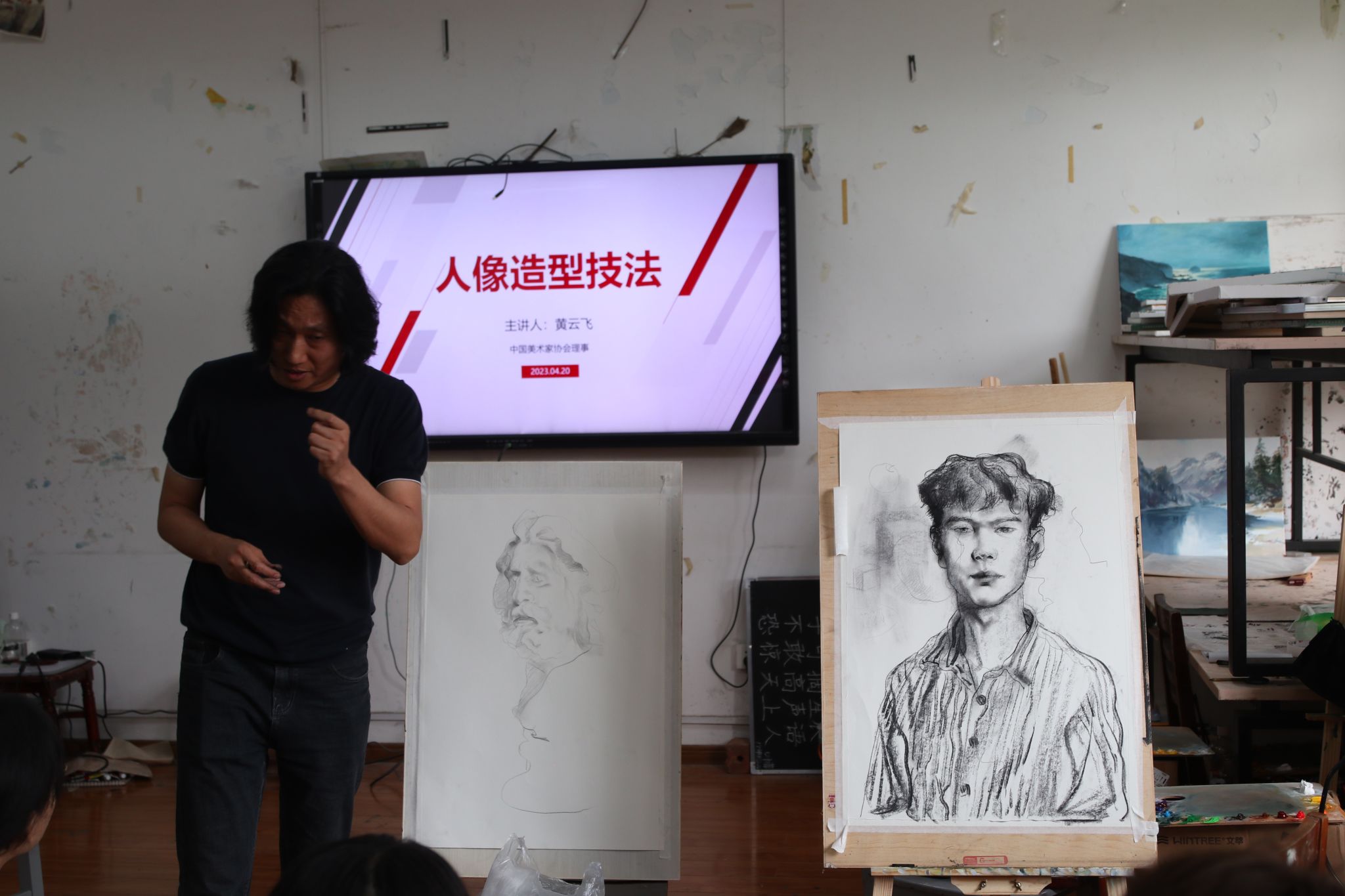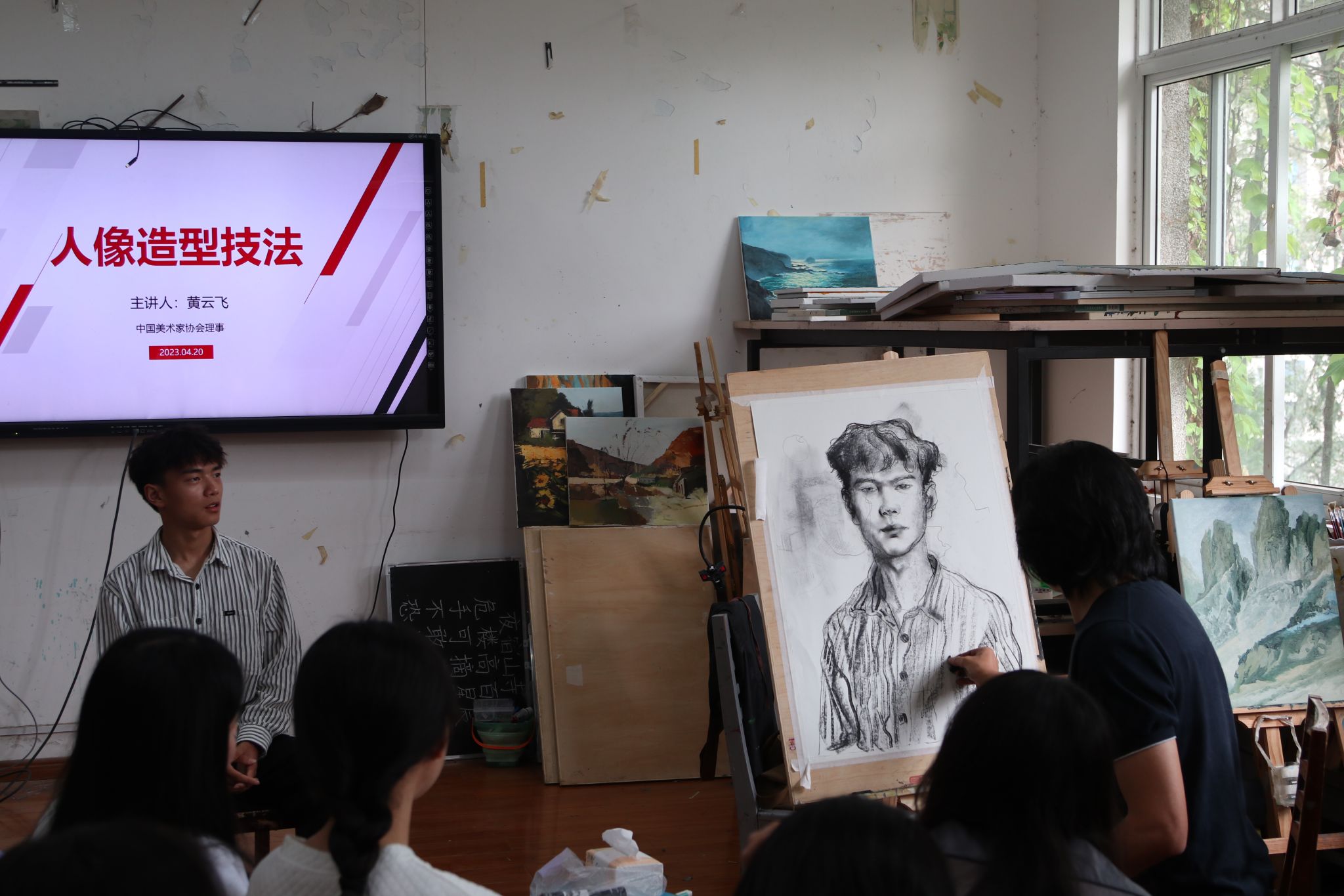 唐剑辉针对油画写生与创作的要领和注意事项进行了讲解,并现场为同学们示范了油画人物写生。黄云飞针对人物造型技巧与方法进行了详细讲解并用不同的技法现场示范了石膏头像和人物头像写生。