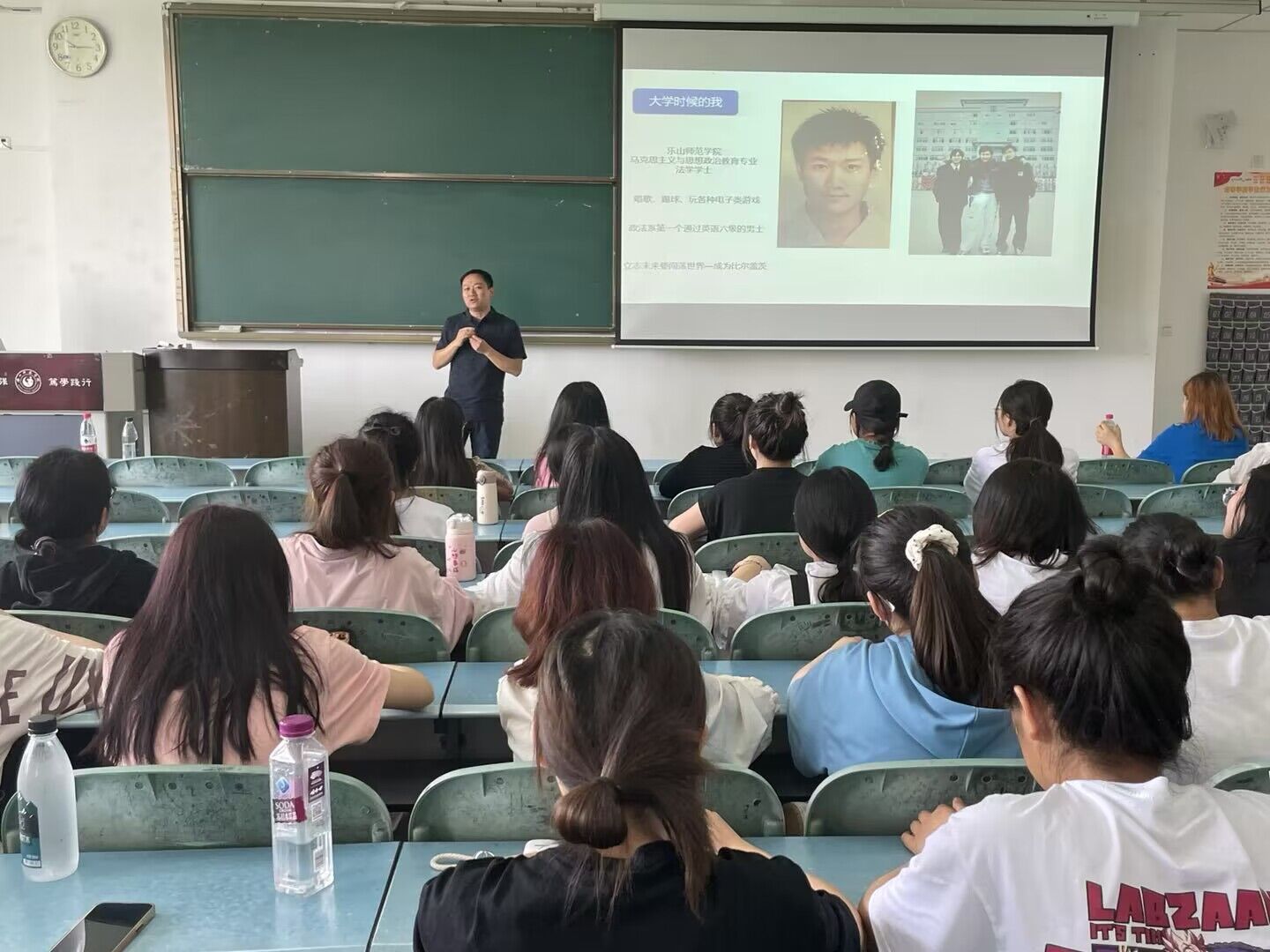 翟雅媛首先对范明进行介绍,他是政法学院01级学生,成都超有范儿科技有限公司创始人,获四川省2022年度十大青年企业家,成都高新区C类人才等荣誉。范明以诙谐幽默的语调切入了主题:“我”与这个世界,他就现在的我进行自我介绍,展现这些来的成果。随后他介绍了大学时候的自己,讲述了2001即千禧后第一年世界现状与2022-2023年世界现状对比,通过技能树形象地展现自己在大学时期的表现、经历、目标,借此鼓励同学们全方面提高自身综合素质来达到自我目标。其次,他介绍了毕业后的自己的工作经历及自己创业现状。他提出我们都是普通人,起点不重要,重要的是设立合适的目标,相信自己的力量,敢于突破自己,迎接新世界。讲座尾声,他把一段祝福语送给了学弟学妹,表达了他的深深祝福和殷切期望。